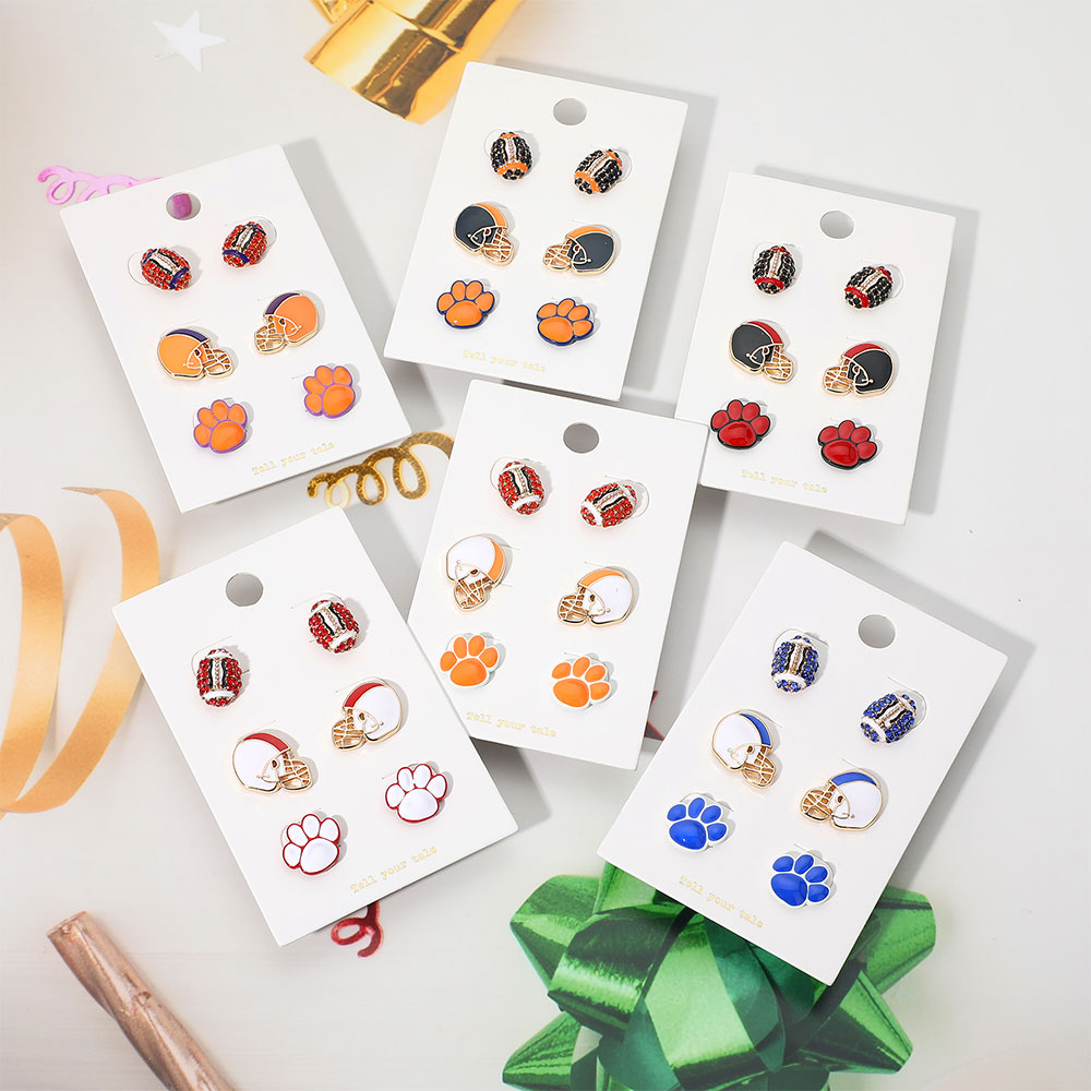 3Pairs - Game Day Spirit Ball Helmet Paw Stud Earring Set