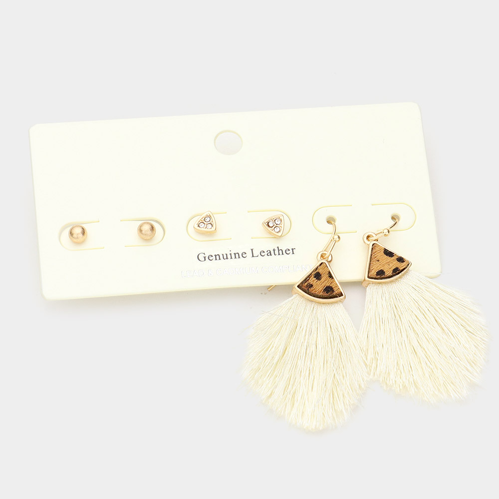 3Pairs - Metal Ball Rhinestone Triangle Fan Shaped Cheetah Patterned Genuine Leather Tassel Fringe Earrings