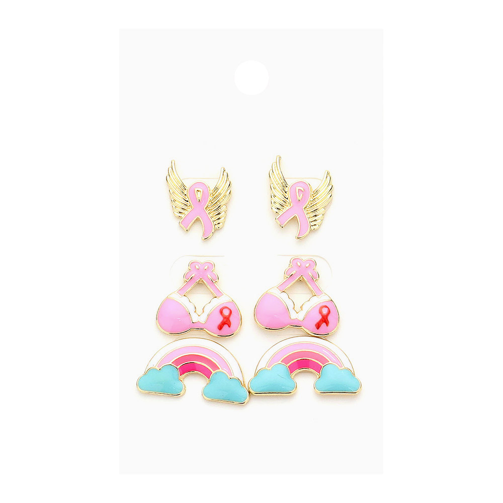 Details • Size : 0.5" L - 0.75" L • Post Back • Express support and positivity with this awareness stud earring set featuring ribbon, bra, and rainbow motifs. A meaningful accessory pack that promotes strength, hope, and inspiration for every occasion. • Lead and Nickel Compliant