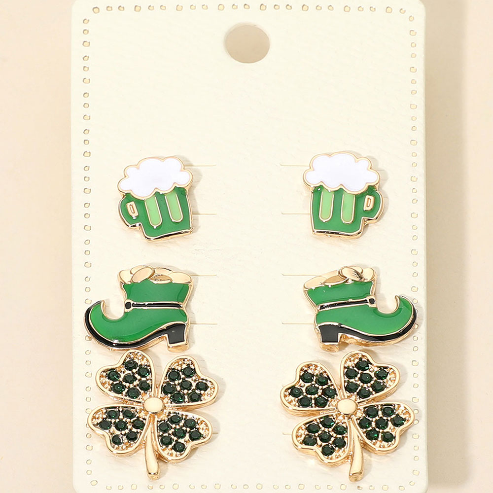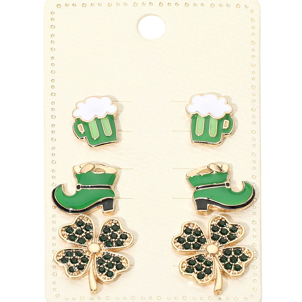 3Pairs - St Patricks Clover Boot Beer Mug Stud Earring Set