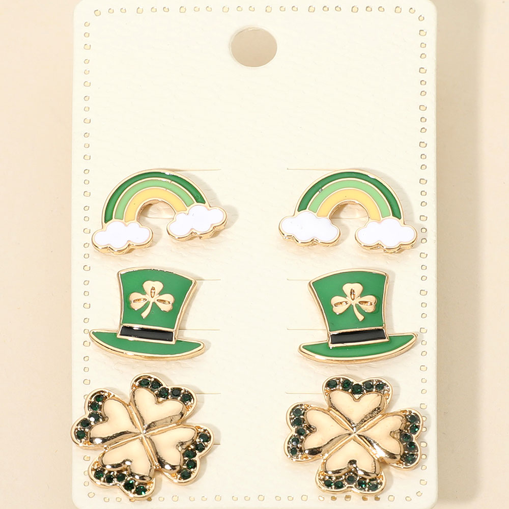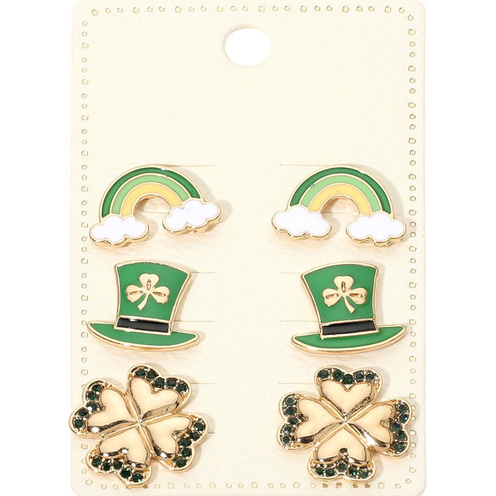 3Pairs - St Patricks Clover Hat Rainbow Stud Earring Set 3Pairs - St Patricks Clover Hat Rainbow Stud Earring Set