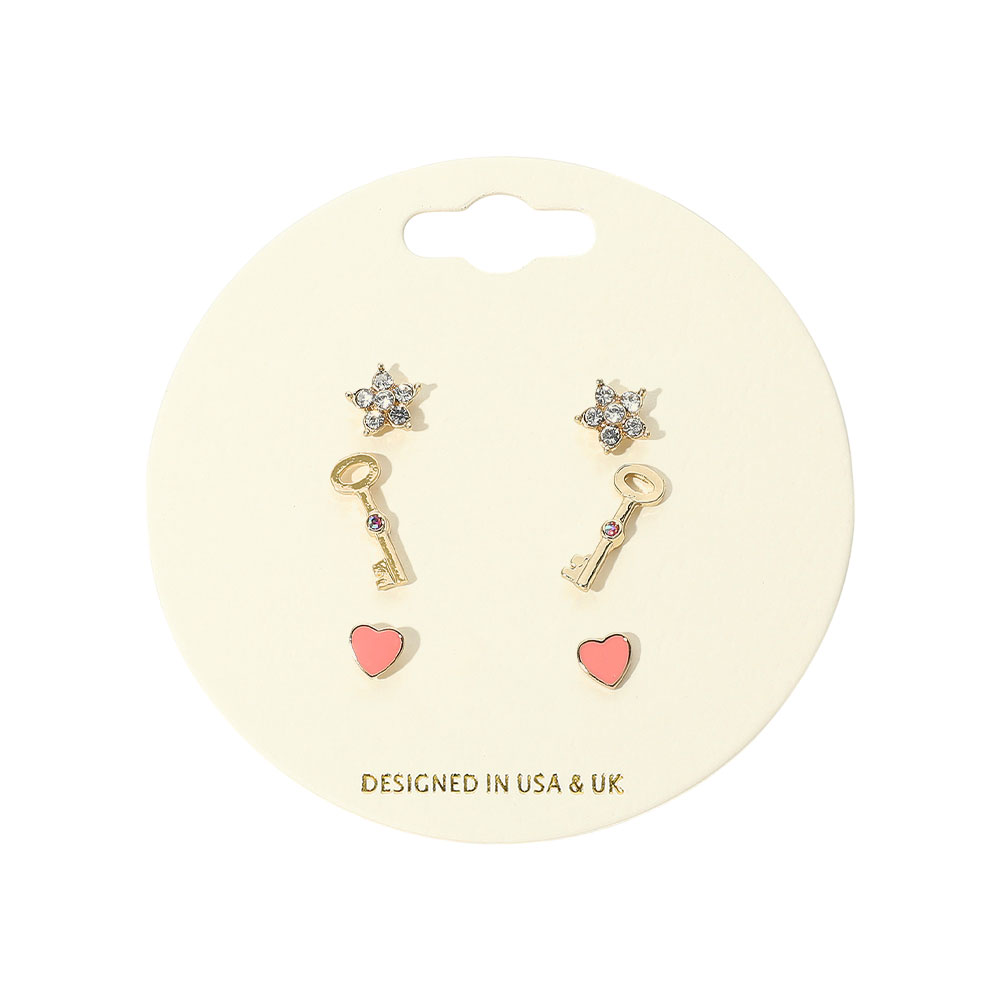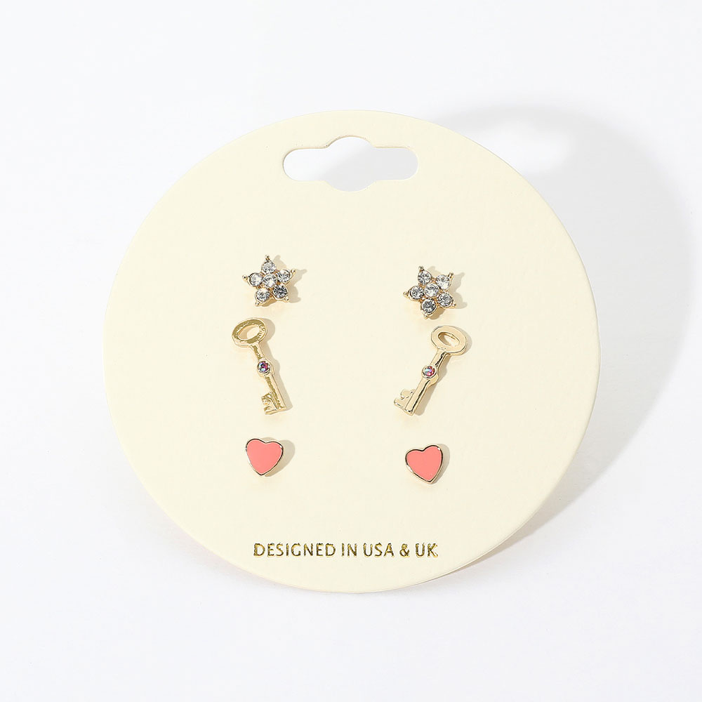 • Charming earring set featuring three unique stud pairs: starburst, key, and heart designs. A playful and elegant mix for any outfit. Perfect for daily wear or gifting.