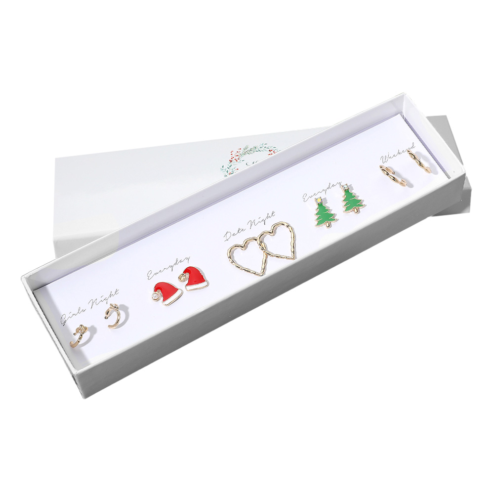 Details • Size : 0.4" - 0.75" L • Post Back • Celebrate the season with this 5-pair earring set featuring moons, Santa hats, hearts, Christmas trees, and chic hoops. A versatile holiday jewelry gift set designed for parties, everyday wear, and festive occasions. • Lead and Nickel Compliant
