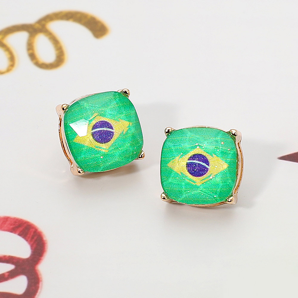 Details • Size : 0.5" X 0.5" • Post Back • Show your pride with these Brazil flag stud earrings, featuring the iconic sun emblem design framed in a sleek setting. Perfect for patriotic celebrations, travel, or everyday wear, these earrings combine national spirit with contemporary elegance for a meaningful, stylish accessory. • Lead and Nickel Compliant