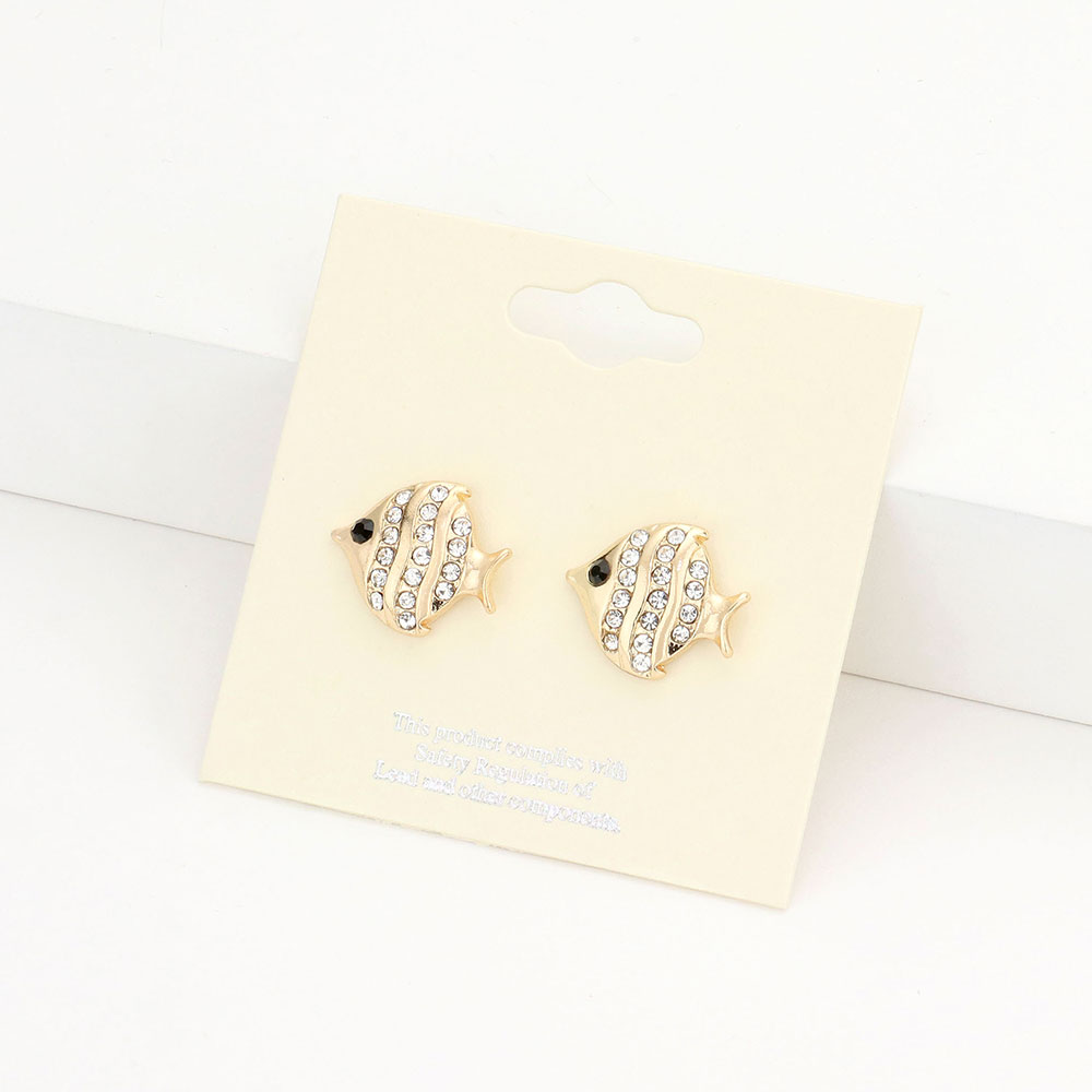 Details • Size : 0.5" X 0.6" • Post Back • These fish crystal stud earrings add a touch of ocean-inspired charm and sparkle to your look. Featuring a playful fish design adorned with glimmering stones, they bring a blend of elegance and whimsy, perfect for expressing your unique style with a fun, polished flair. • Lead and Nickel Compliant