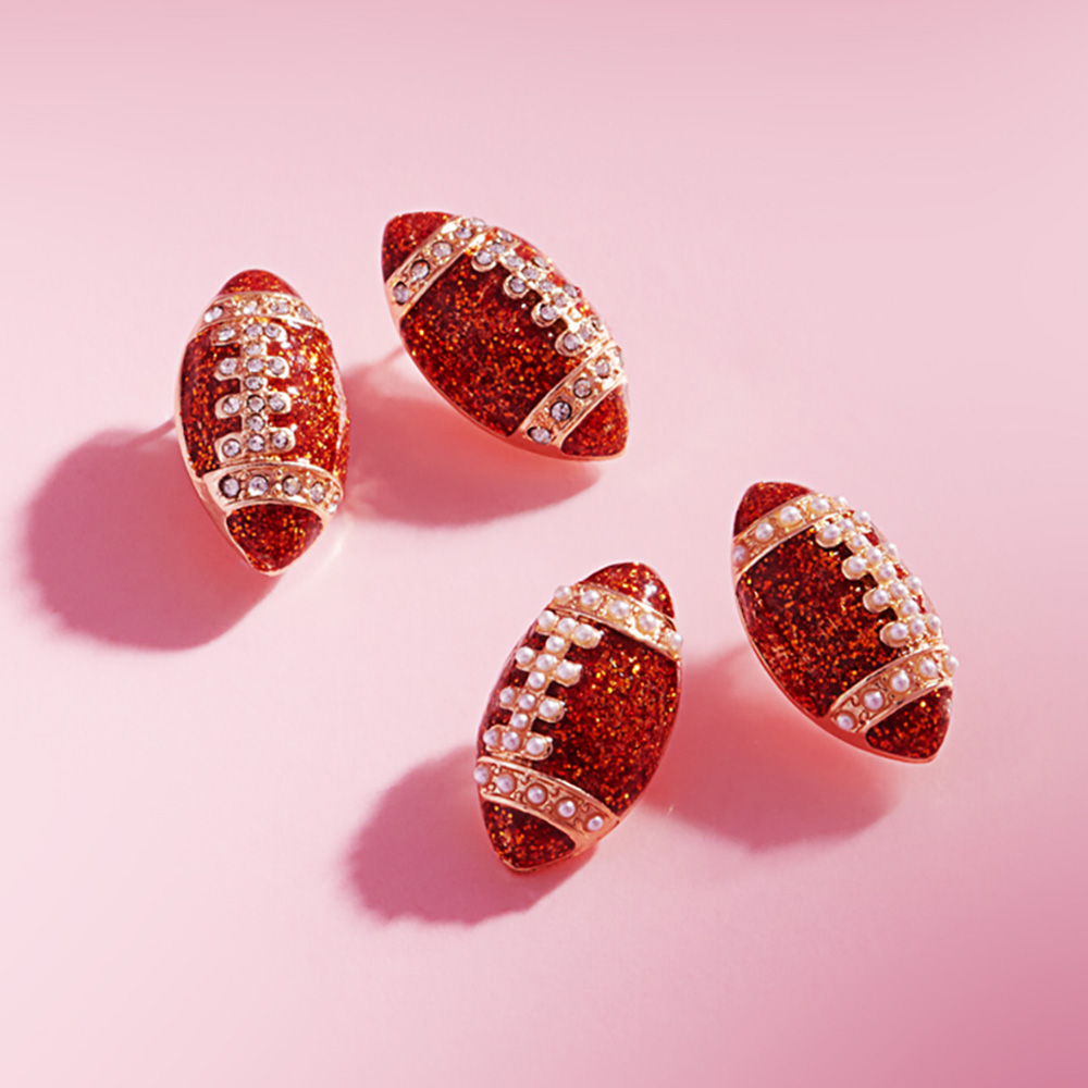 Details • Size : 0.5" X 0.8" • Titanium Post Back • Game day ready football stud earrings featuring a glittery finish and sparkling rhinestone accents. Perfect for showing team spirit, these playful earrings add a bold statement to any sporty or festive outfit. • Hypoallergenic • Lead and Nickel Compliant