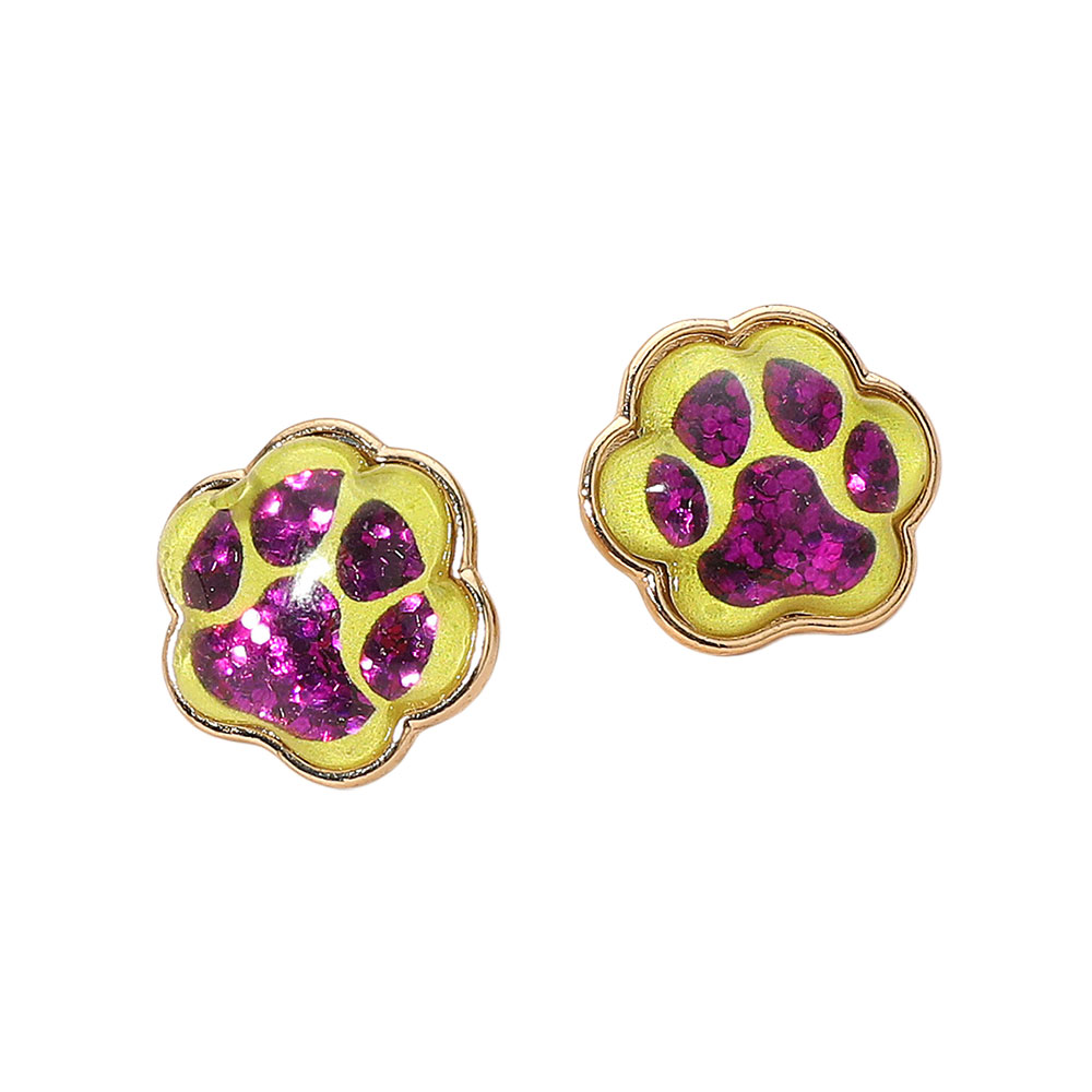Details • Size : 0.9" X 0.9" • Post Back • Stud earrings designed with glitter-filled paw print accents in multiple color options. Fun and lightweight, these earrings are the perfect way to show team spirit, school pride, or playful style on game day and beyond. • Lead and Nickel Compliant