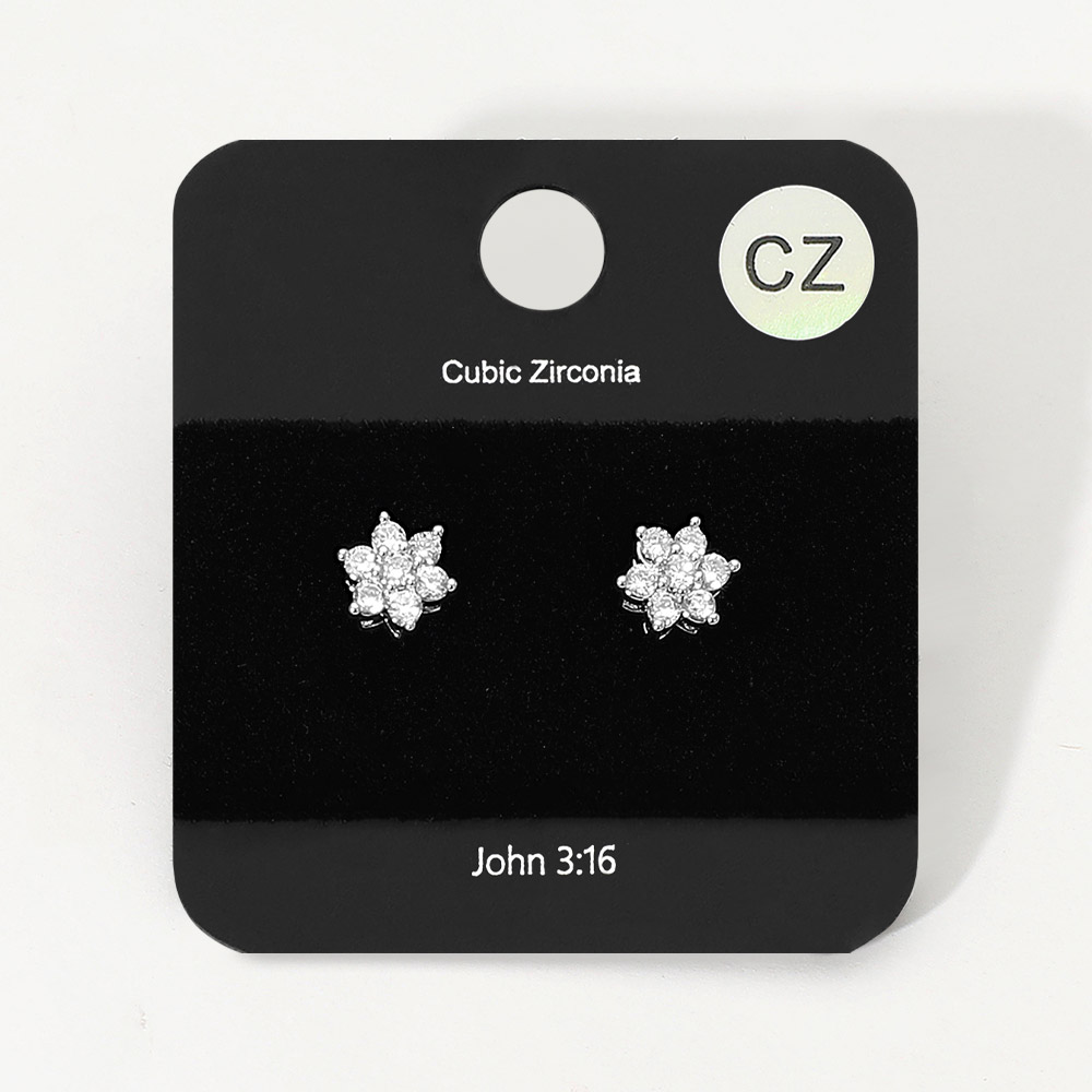Details • Size : 0.25" X 0.25" • Post Back • These floral cubic zirconia stud earrings capture timeless beauty with their sparkling petal-like design. Each earring radiates elegance and brilliance, perfect for adding a graceful touch to casual looks or complementing evening attire with refined sophistication. • CZ Cubic Zirconia • Lead and Nickel Compliant