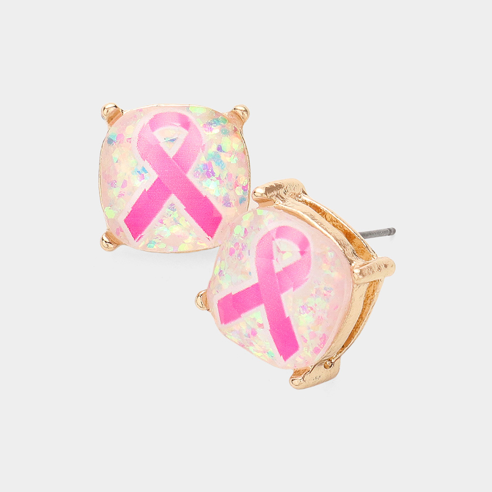 Pink Ribbon Square Stone Stud Earrings