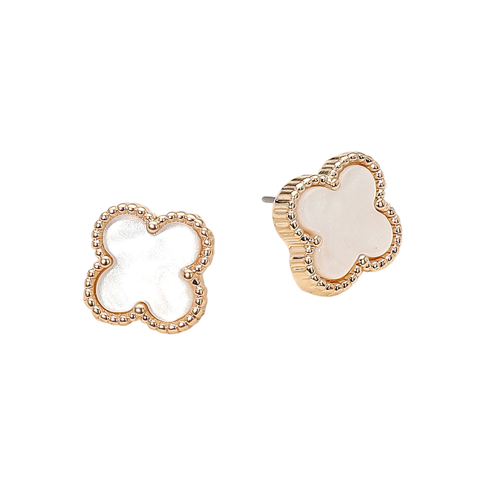 Details • Size : 0.6" X 0.6" • Post Back • Stylish stud earrings featuring a quatrefoil shape framed with textured trim for a chic, timeless look. Perfect for elevating everyday outfits or pairing with elegant attire, these earrings offer a touch of sophistication and modern simplicity in one graceful design. • Lead and Nickel Compliant