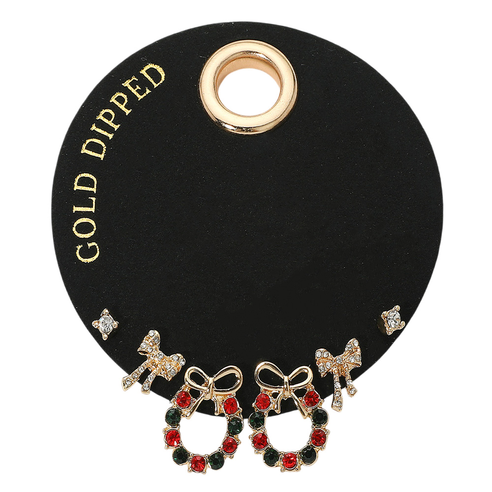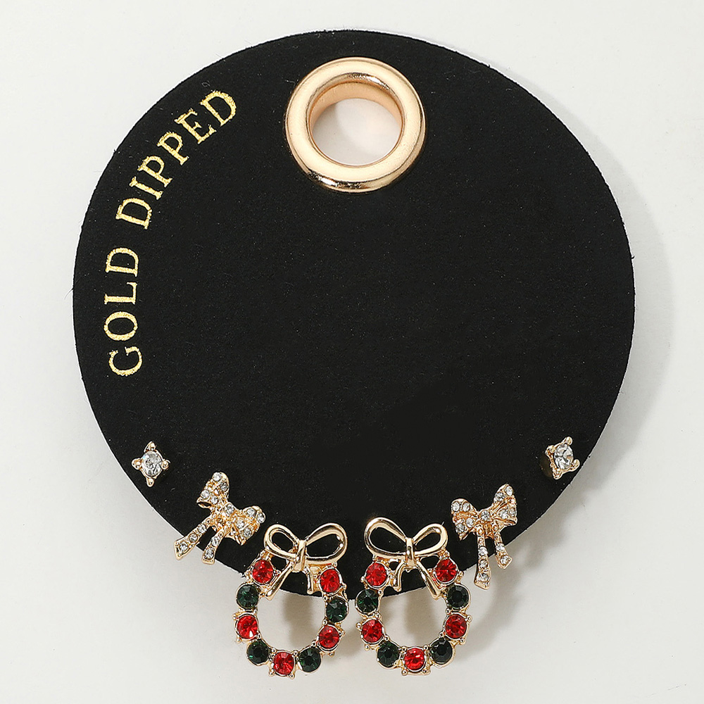 Details • Size : 0.1" - 0.7" L • Post Back • Charming gold dipped earring set featuring sparkling bows, classic studs, and festive wreath designs adorned with vibrant accents. Perfect for adding a joyful holiday touch to your seasonal looks or gifting to someone special. • Gold Dipped