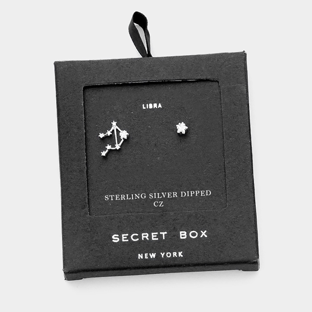 Secret Box_Sterling Silver Dipped CZ Stone Paved Libra Zodiac Sign Stud Earrings