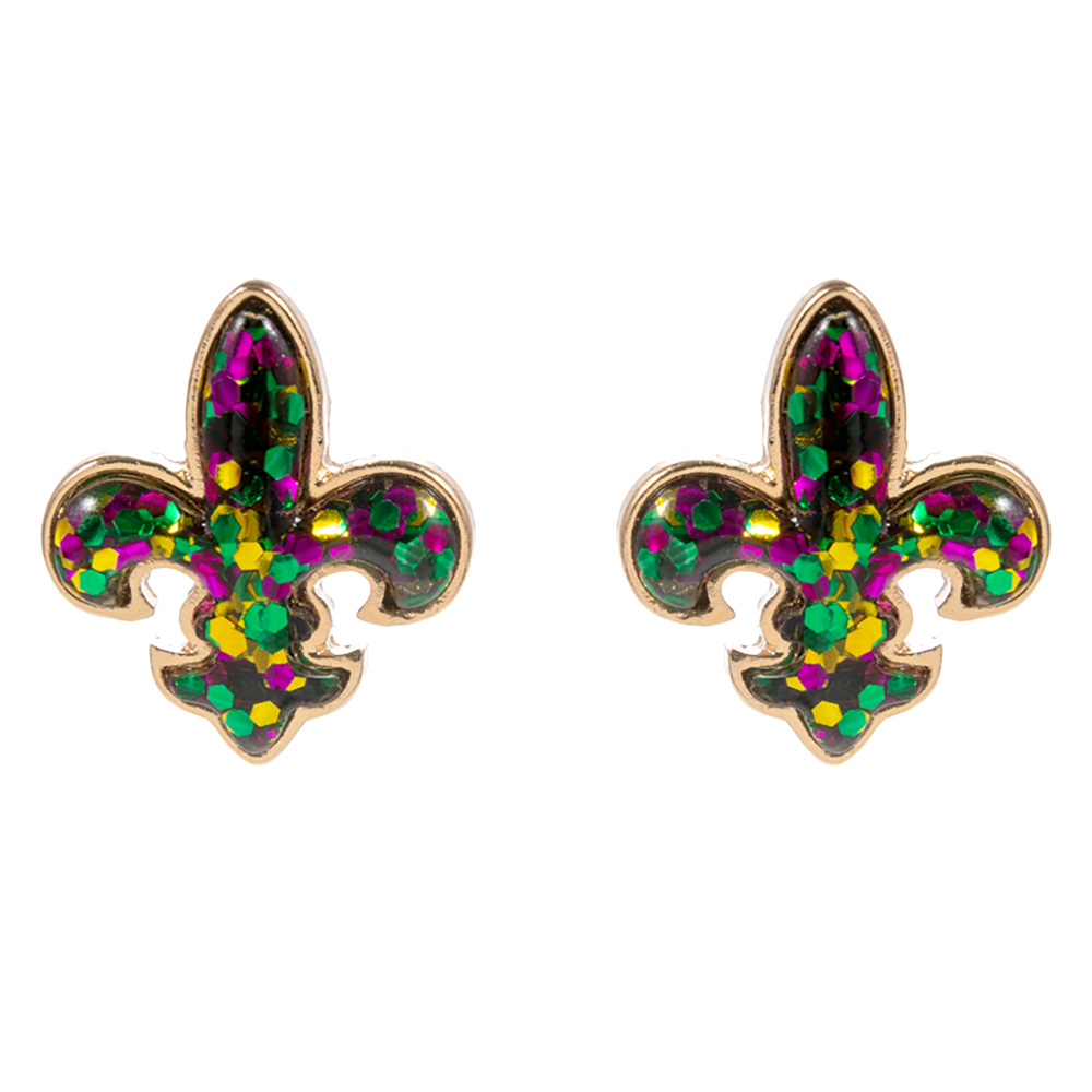 Details • Size : 0.7" X 0.75" • Titanium Post Back • Stylish fleur-de-lis stud earrings featuring a shimmering glitter accent for a festive and bold look. Perfect for celebrations, themed events, or everyday sparkle, these earrings bring charm and personality to any outfit, offering a unique touch of vibrant and elegant style. • Hypoallergenic • Lead and Nickel Compliant
