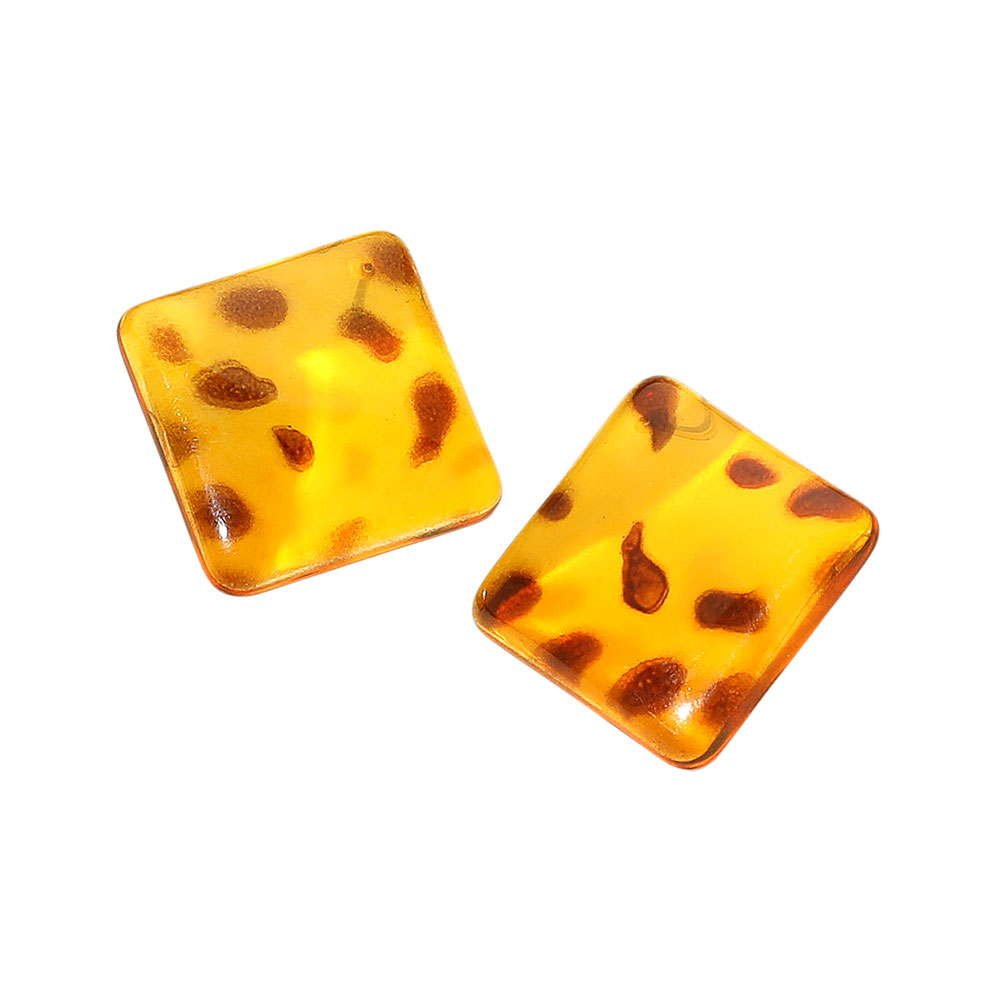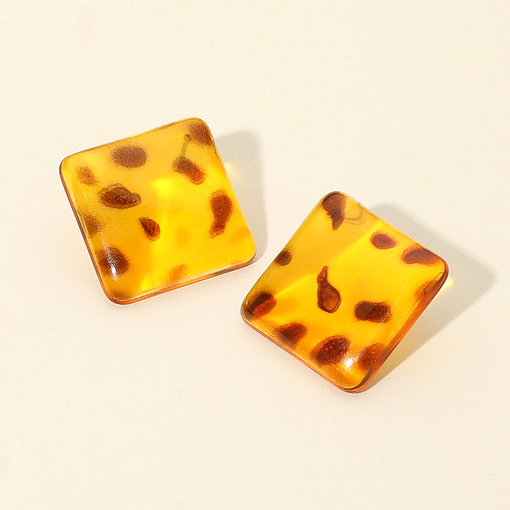 Details • Size : 1.4" X 1.4" • Post Back • Chic square stud earrings designed in a glossy tortoise-style resin finish. Lightweight and versatile, these studs bring a modern twist to a timeless look, perfect for everyday wear. • Lead and Nickel Compliant