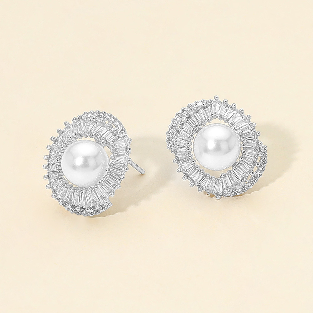 Details • Size : 0.6" X 0.7" • Post Back • Sophisticated stud earrings featuring a luminous pearl center surrounded by a radiant halo of sparkling CZ baguettes. Their timeless elegance makes them perfect for weddings, evening events, or daily sophistication, offering a refined accessory that enhances any look with classic charm. • Brass • CZ Cubic Zirconia • Gold Dipped • Hypoallergenic • Lead and Nickel Compliant • Made In Korea