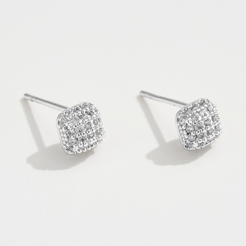 White Gold Dipped CZ Stone Paved Mini Square Stud Earrings