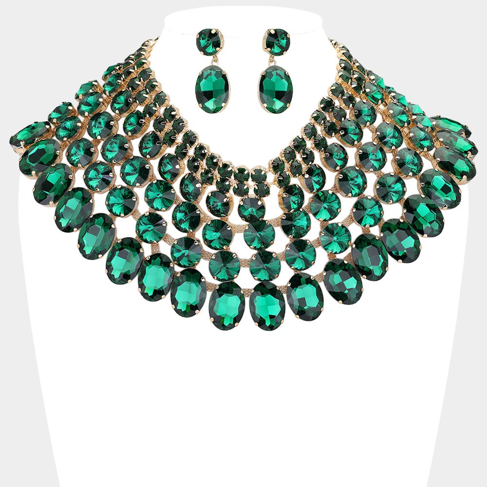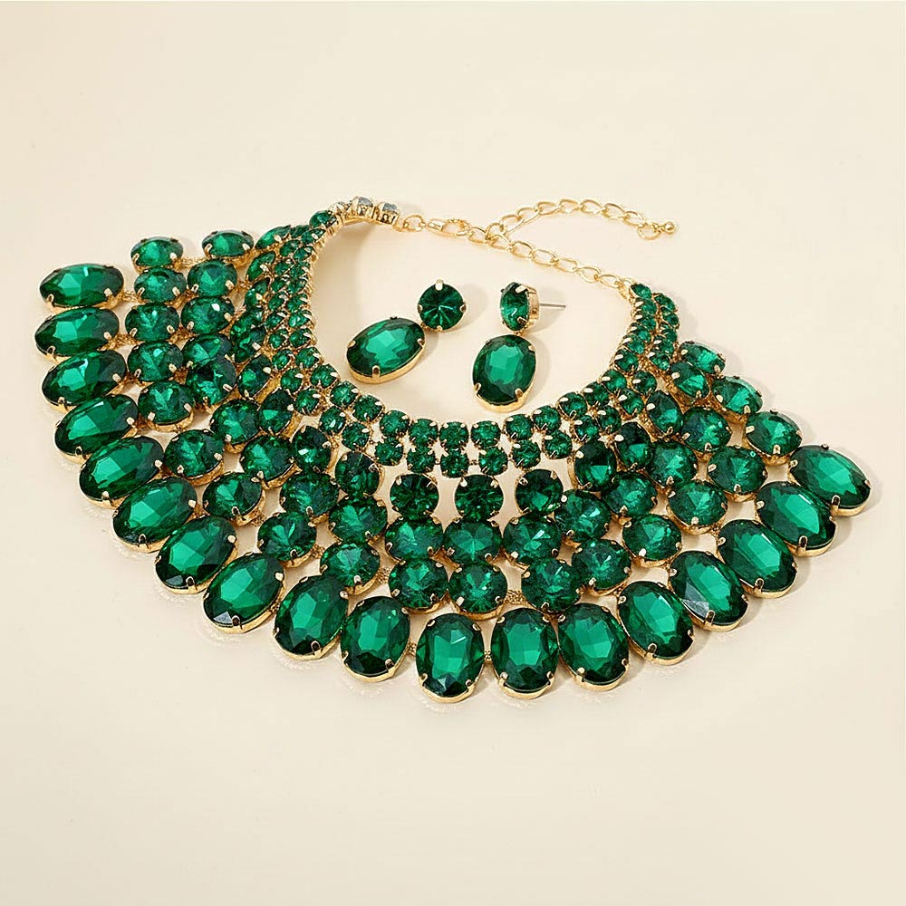 • Dramatic bib necklace and earring set featuring layered oval stones arranged in a bold cascading design. Perfect for weddings, galas, performances or any occasion that calls for standout glamour. An eye-catching accessory set that elevates formal and evening looks.