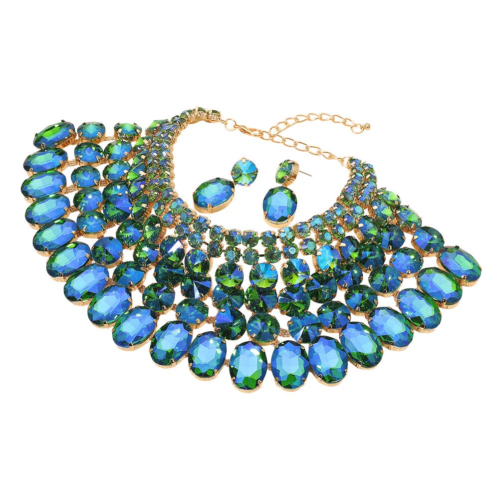• Dramatic bib necklace and earring set featuring layered oval stones arranged in a bold cascading design. Perfect for weddings, galas, performances or any occasion that calls for standout glamour. An eye-catching accessory set that elevates formal and evening looks.