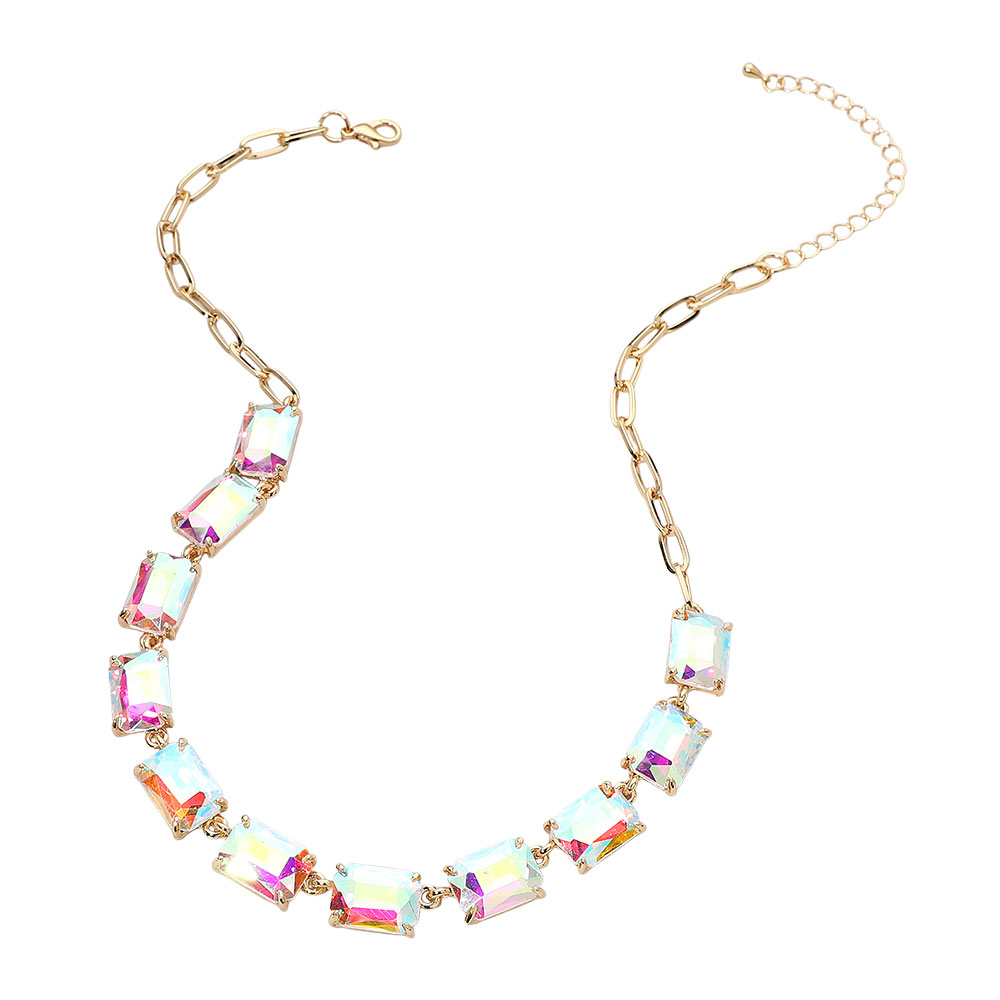 • This elegant gemstone chain necklace features a row of precisely cut stones linked with a sleek chain for a refined, modern look. Its adjustable closure ensures a comfortable fit, making it a sophisticated accessory for formal occasions, evening wear, or adding a statement touch to everyday style.