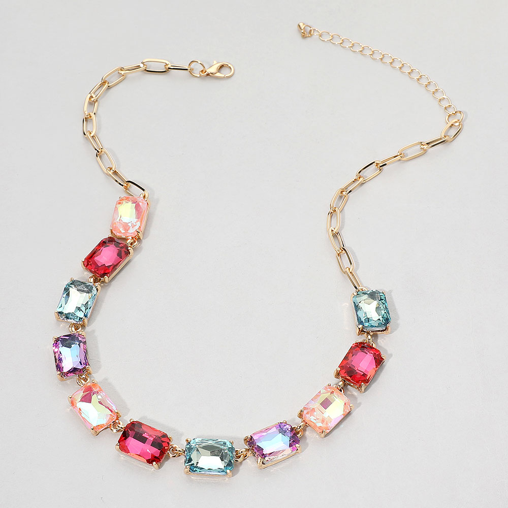 • This elegant gemstone chain necklace features a row of precisely cut stones linked with a sleek chain for a refined, modern look. Its adjustable closure ensures a comfortable fit, making it a sophisticated accessory for formal occasions, evening wear, or adding a statement touch to everyday style.