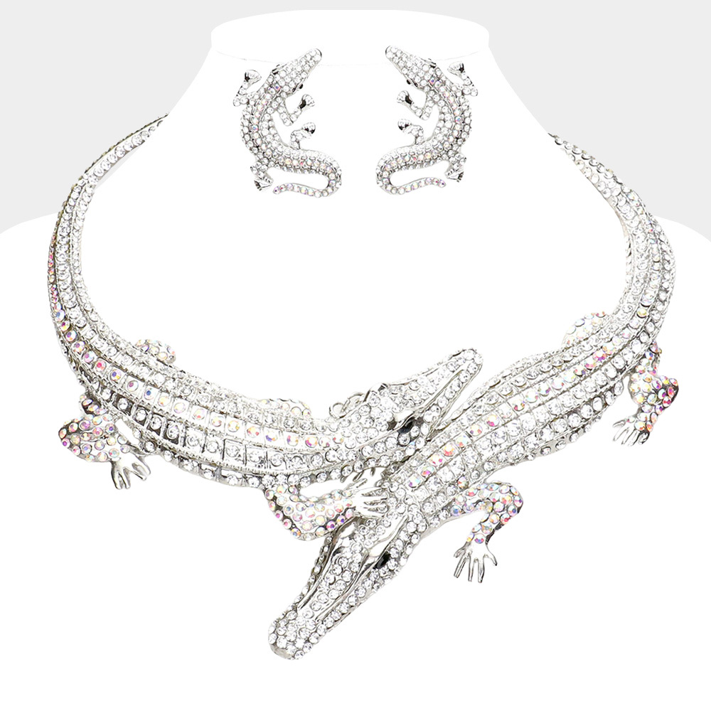 • Make a bold fashion statement with this striking crocodile jewelry set, featuring a detailed necklace and matching earrings adorned with sparkling accents. Perfect for adding edge and sophistication, this unique set is ideal for special occasions or as a standout gift for jewelry lovers.