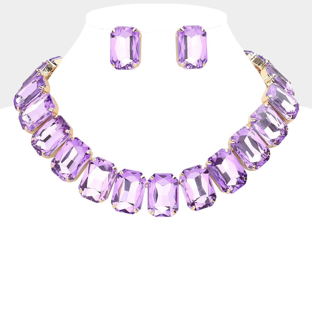 Details • Necklace Size : 16.5" + 3.25" L • Decor Size : 1" L • Earring Size : 1" L • Striking necklace and earring set featuring rectangular stones arranged in a clean, modern silhouette. Perfect for formal events, performances or adding standout shine to evening outfits. A bold statement accessory set that elevates any look with sleek, eye-catching style. • Lead and Nickel Compliant