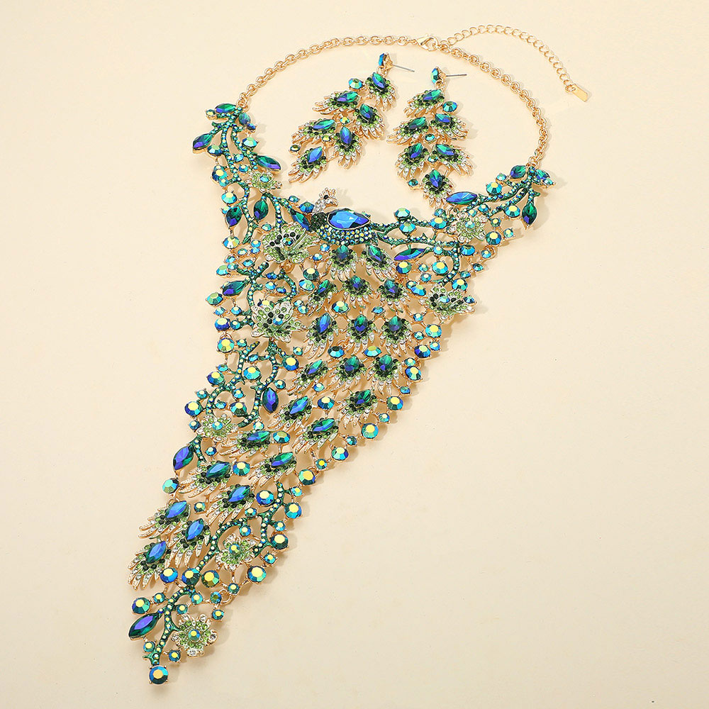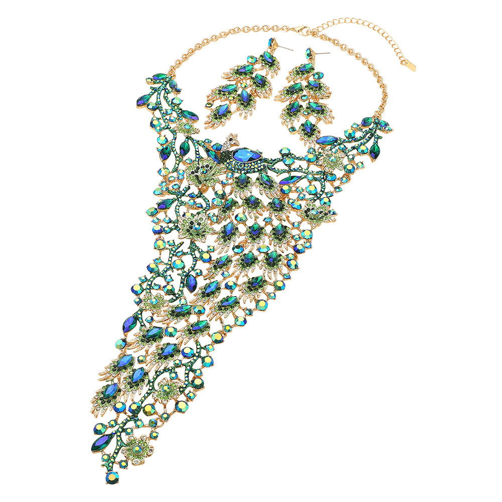 • Turn heads with this breathtaking peacock-inspired necklace and earrings set, featuring cascading crystals in a radiant floral and feather motif. A bold statement piece perfect for weddings, galas, or any special occasion where glamour takes center stage.