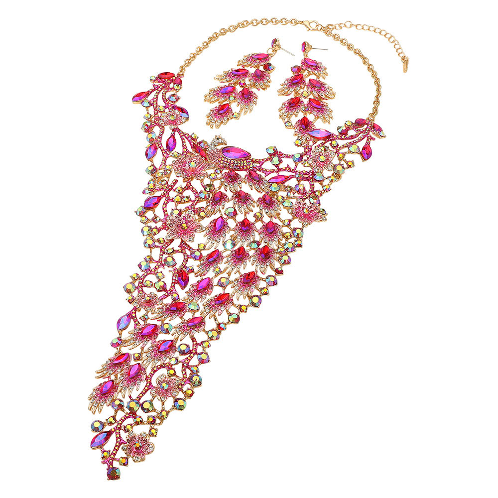 • Turn heads with this breathtaking peacock-inspired necklace and earrings set, featuring cascading crystals in a radiant floral and feather motif. A bold statement piece perfect for weddings, galas, or any special occasion where glamour takes center stage.