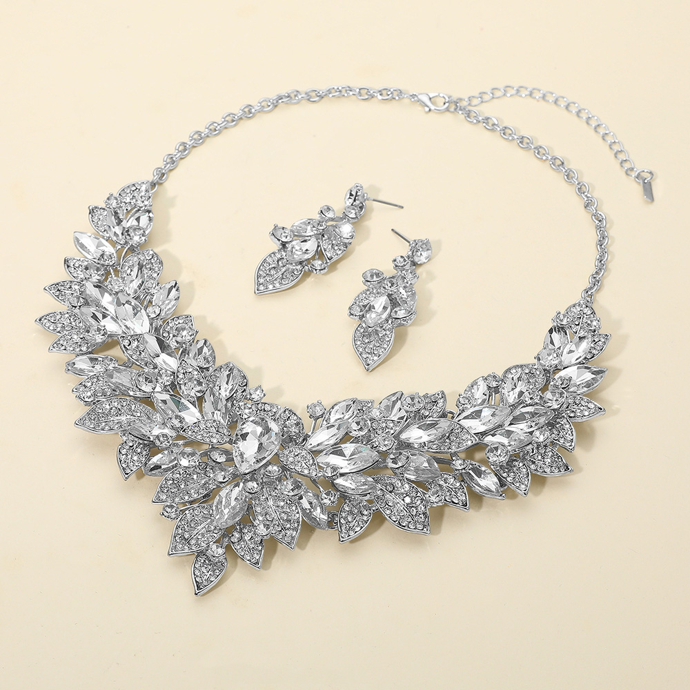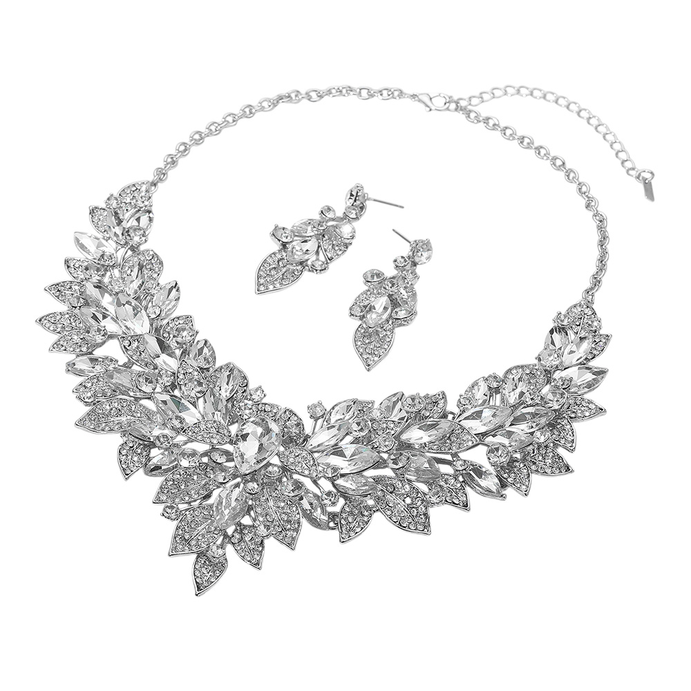 Details • Necklace Size : 21" + 4" L • Decor Size : 2.75" L • Earrings Size : 2.3" L • Glamorous statement necklace with matching earrings featuring sparkling crystal leaf designs. Perfect for weddings, parties, and special occasions, this dazzling jewelry set adds elegance and brilliance to any outfit, making it the ultimate accessory for formal events. • Lead and Nickel Compliant