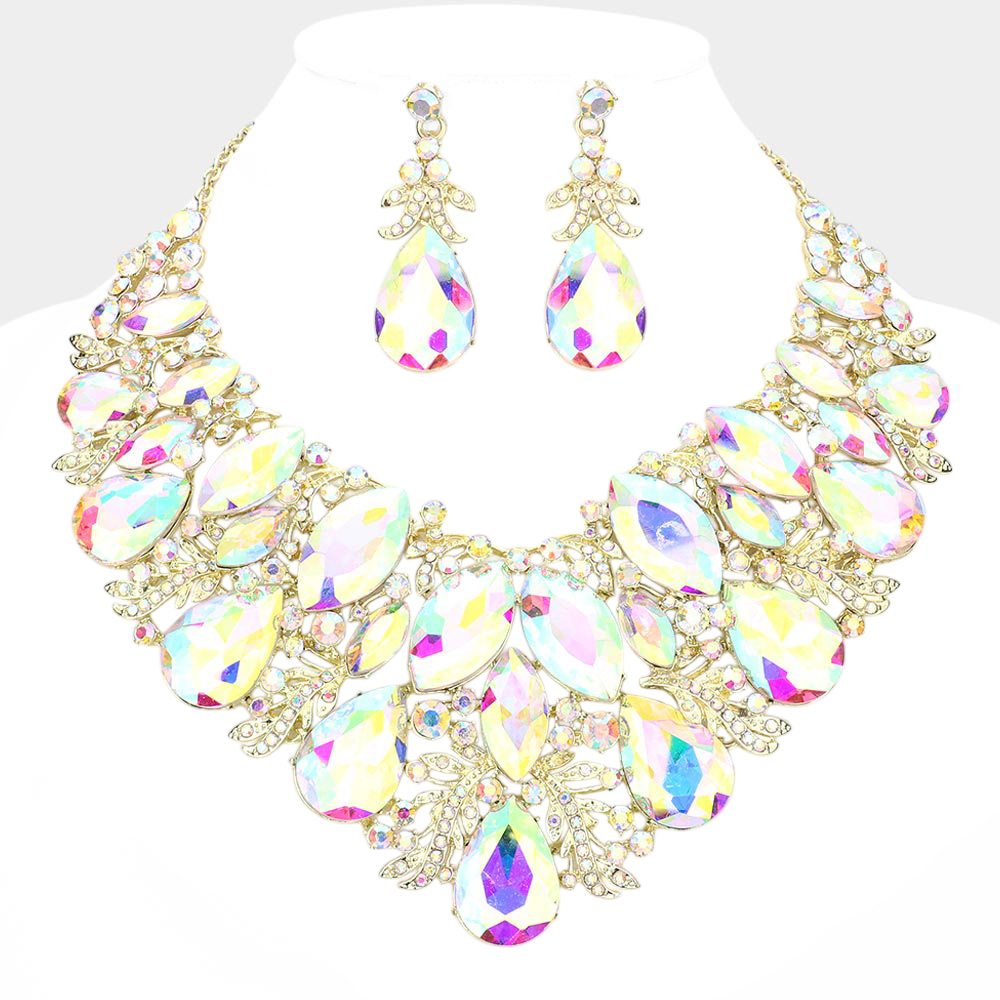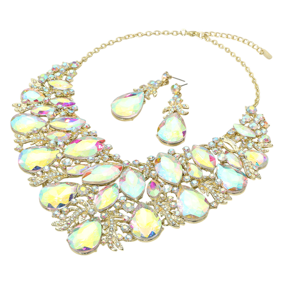 Details • Necklace Size : 18.5" + 2.5" L • Decor Size : 3" L • Earring Size : 2.25" L • This dazzling jewelry set features a statement necklace adorned with iridescent teardrop gems and crystal accents, paired with matching drop earrings. Perfect for special occasions, it adds radiant sparkle and glamour to any evening or formal outfit.