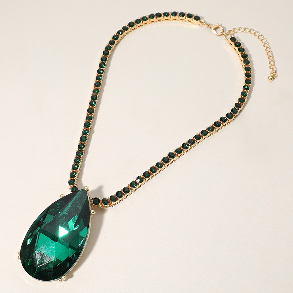 Oversized Teardrop Glass Stone Pendant Bling Studded Chunky Chain Necklace
