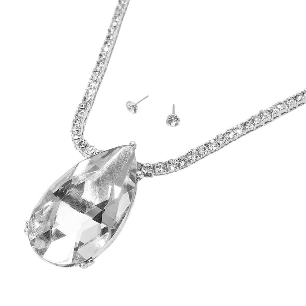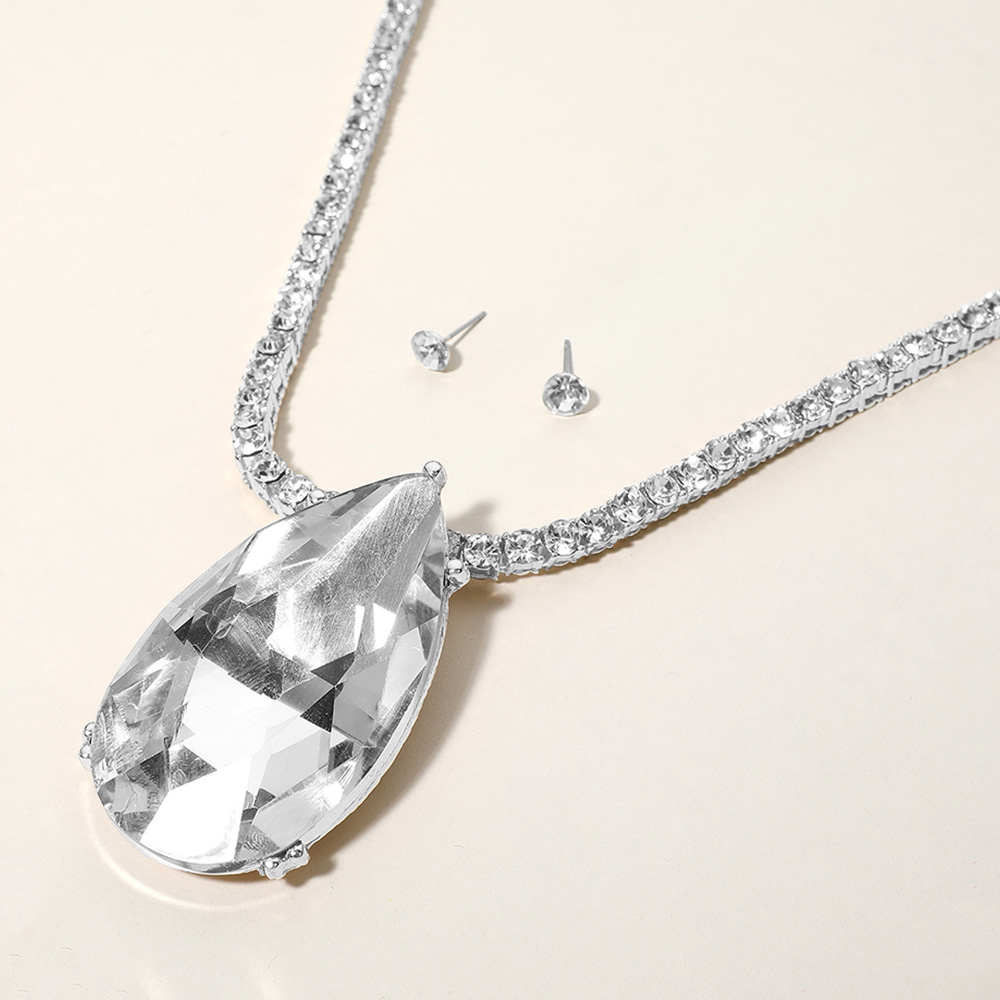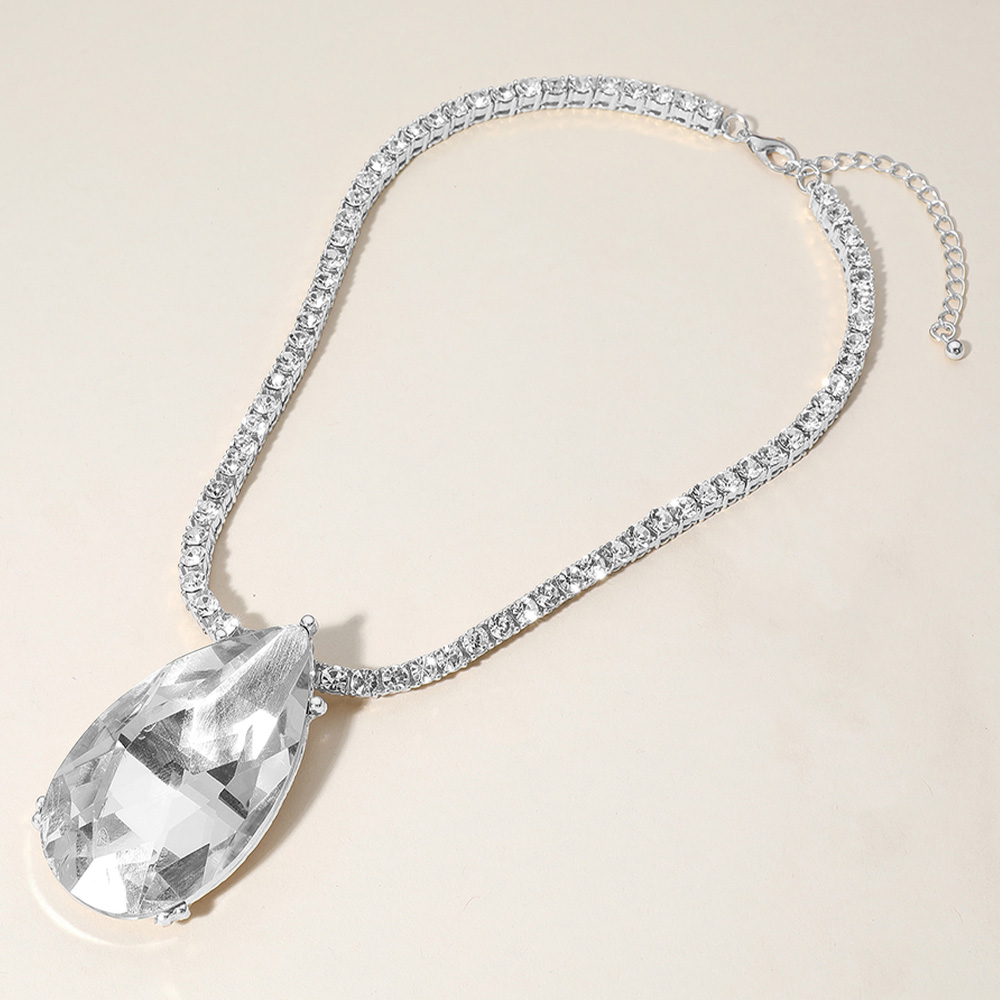 Oversized Teardrop Glass Stone Pendant Bling Studded Chunky Chain Necklace