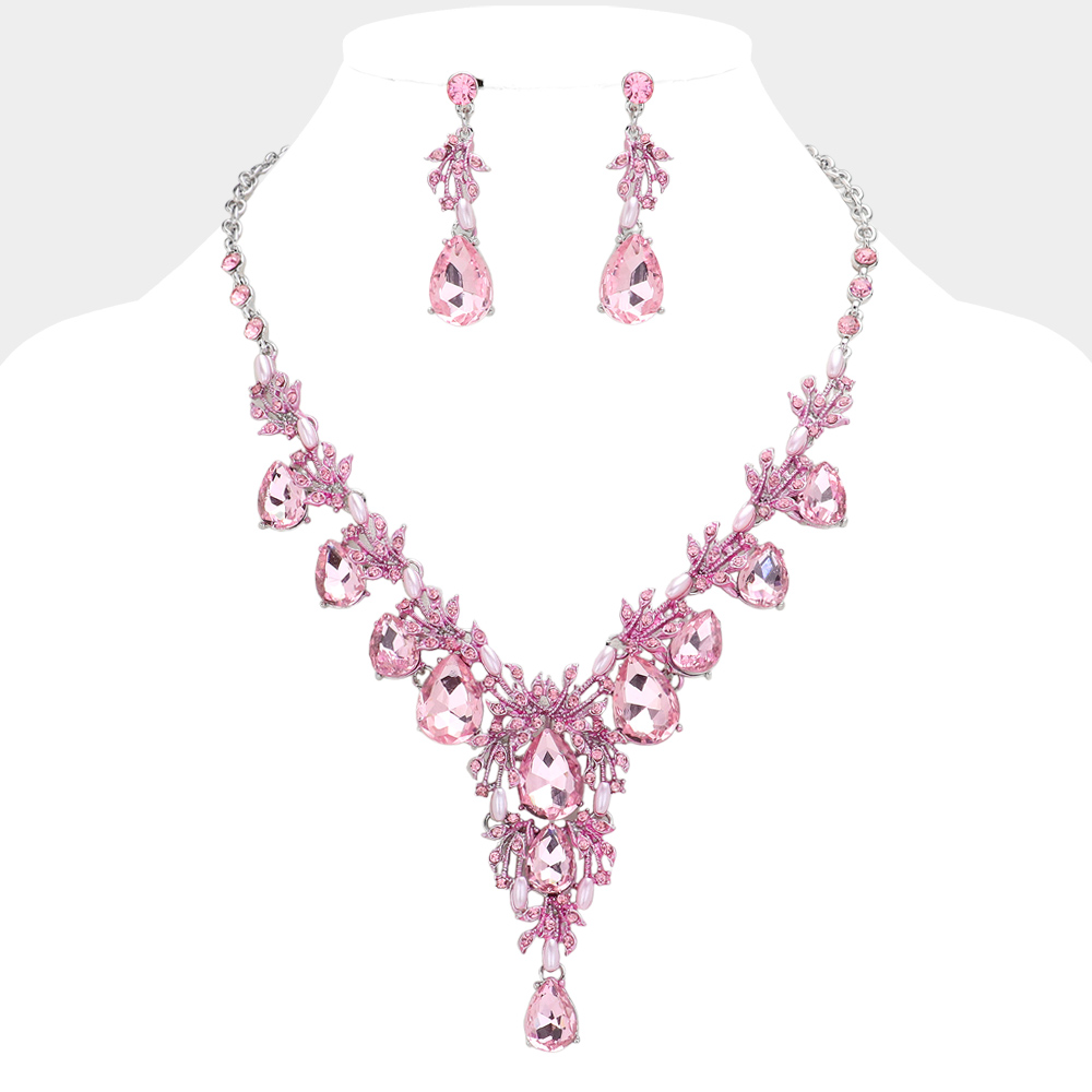 Pearl Rhinestone Paved Vine Teardrop Stone Cluster Link Evening Necklace