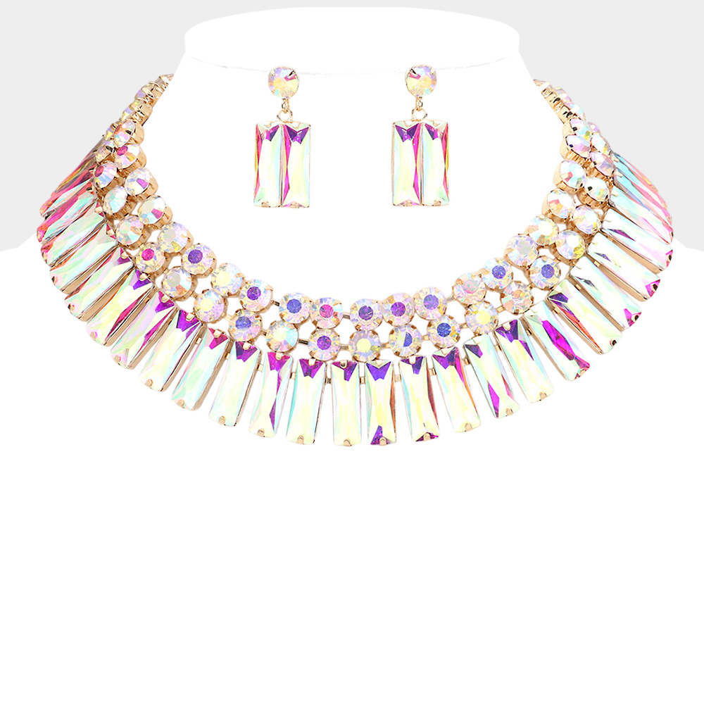 Details • Necklace Size : 16" + 4.5" L • Decor Size : 1.5" L • Earring Size : 1.5" L • Shine from every angle with this iridescent rhinestone statement necklace and matching earrings. Featuring radiant rectangular crystals paired with shimmering round stones, this bold set reflects rainbow hues for a dazzling finish. Perfect for stage, pageants, parties, and special occasions, this design instantly elevates any evening or event look. Lightweight yet striking, it’s a go-to accessory for making a glamorous entrance.
