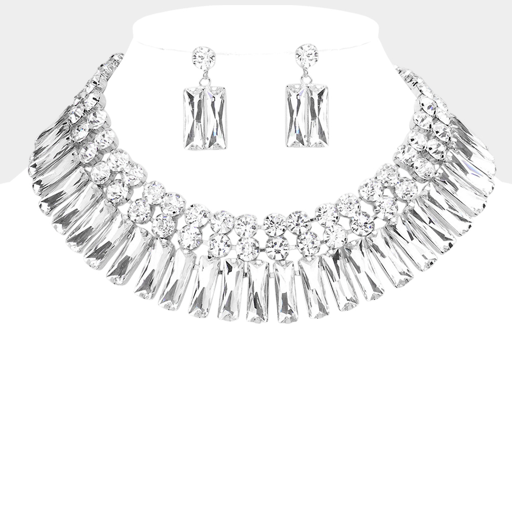 • Shine from every angle with this iridescent rhinestone statement necklace and matching earrings. Featuring radiant rectangular crystals paired with shimmering round stones, this bold set reflects rainbow hues for a dazzling finish. Perfect for stage, pageants, parties, and special occasions, this design instantly elevates any evening or event look. Lightweight yet striking, it’s a go-to accessory for making a glamorous entrance.
