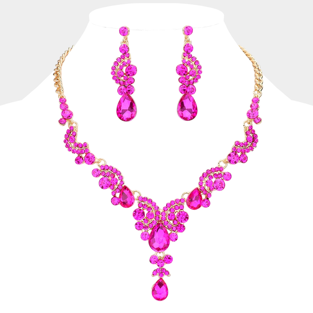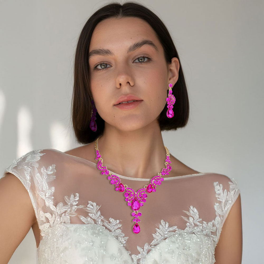 • Stunning teardrop crystal necklace and earring set designed with intricate clustered detailing and sparkling stones. Features a graceful V-shaped centerpiece and matching drop earrings, perfect for formal events, weddings, parties, and special occasions. A glamorous statement set that elevates any outfit.
