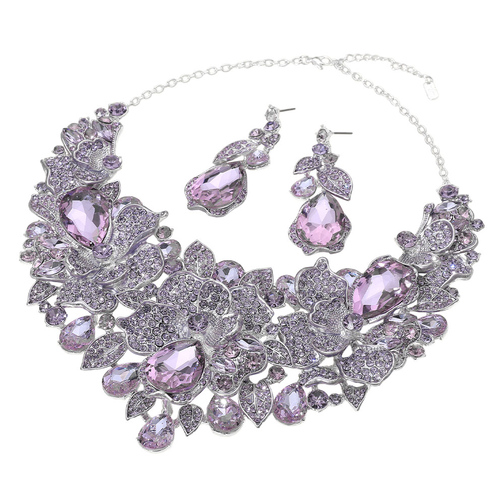 • Elegant floral statement necklace set with sparkling crystal accents and matching drop earrings. Perfect for formal events, weddings, or pageants. Adds glamour and sophistication to any ensemble.