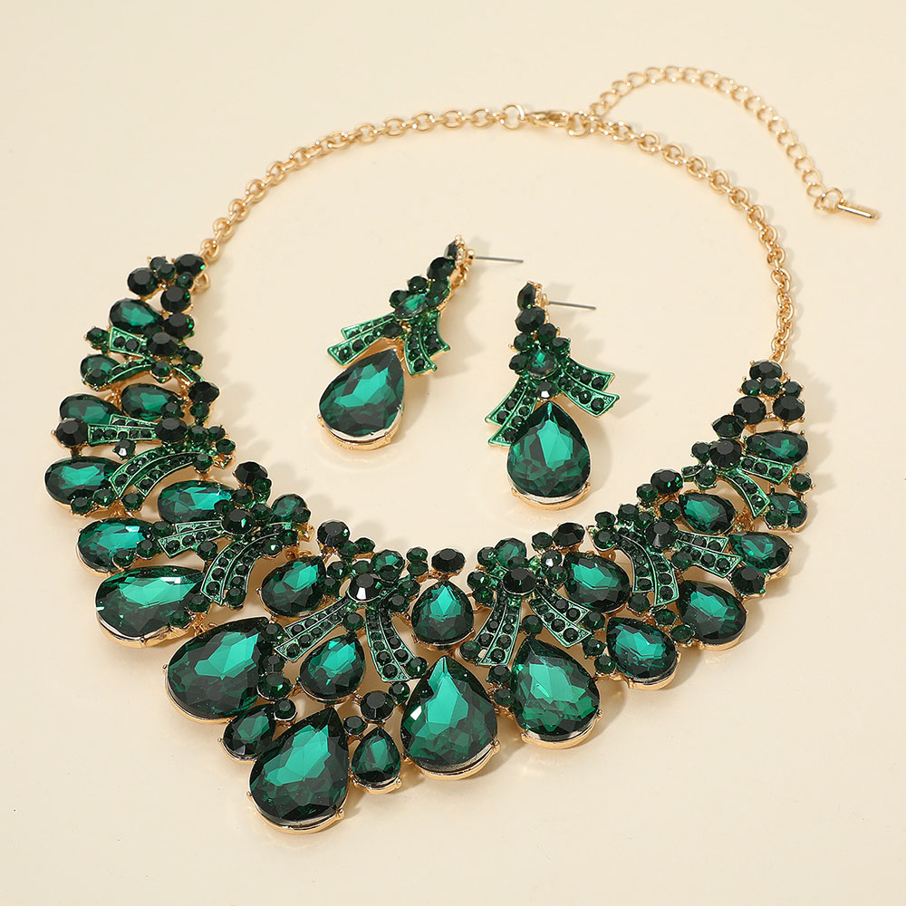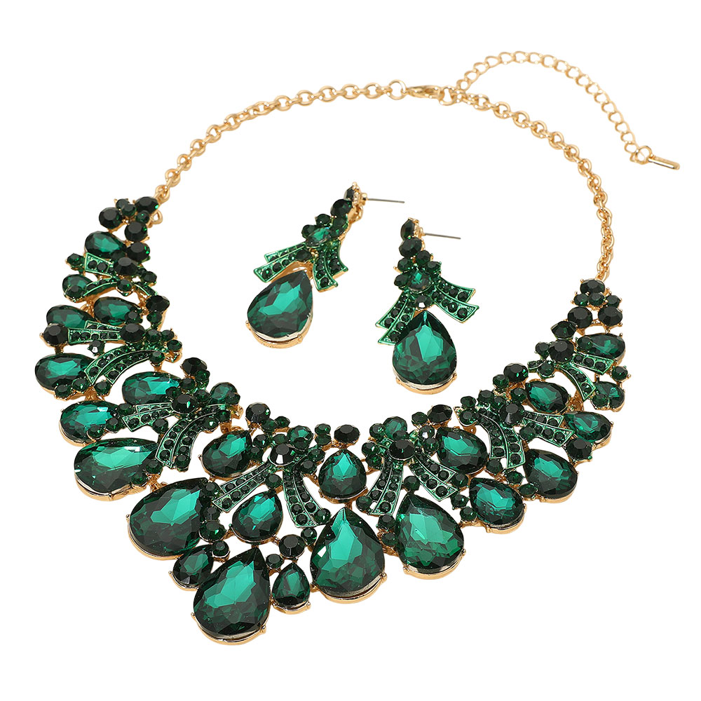 • Make an unforgettable impression with this statement teardrop bib necklace and earring set. Adorned with an array of dazzling stones and intricate detailing, this bold jewelry set adds luxurious sparkle and sophistication—perfect for weddings, galas, and evening events.