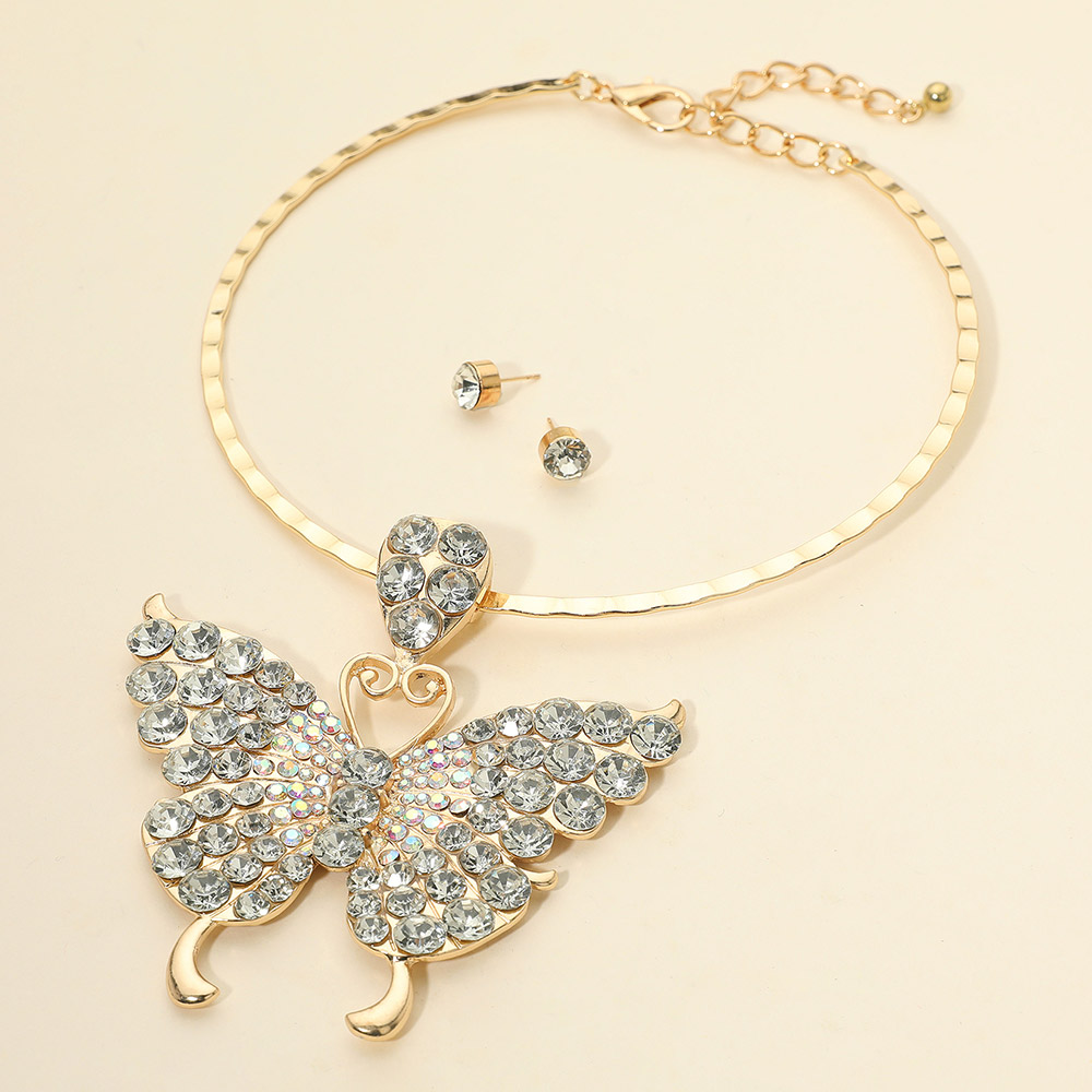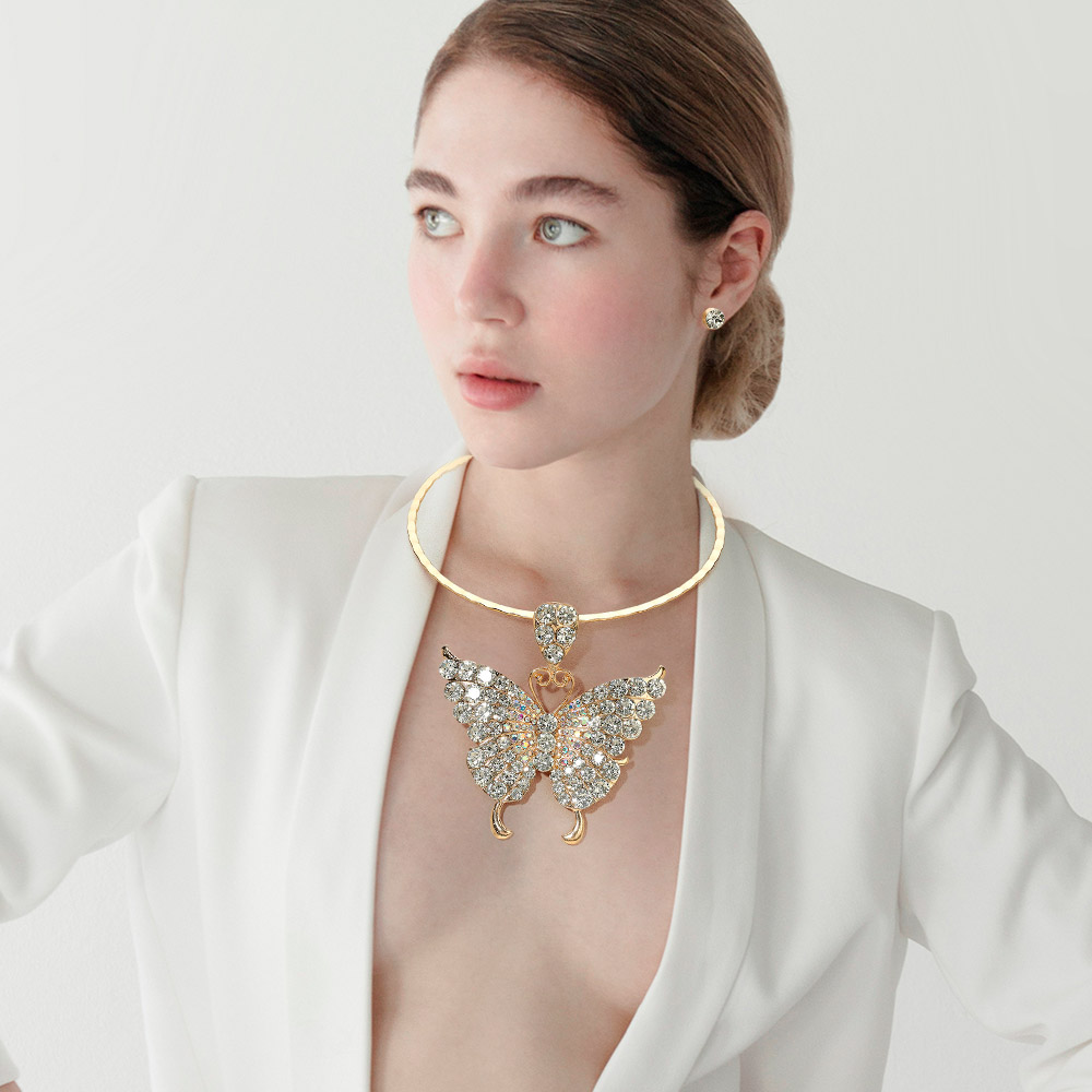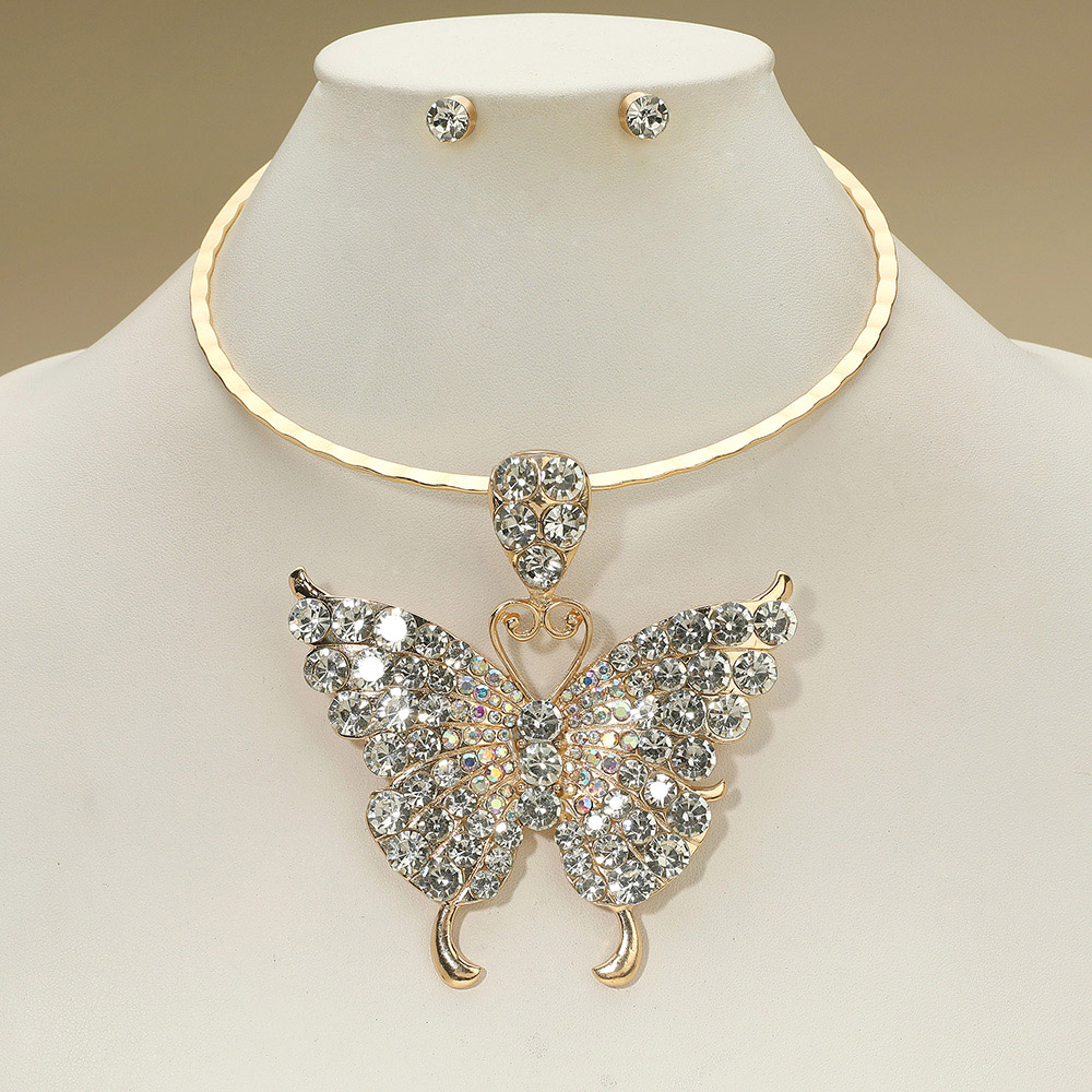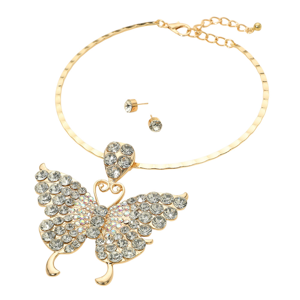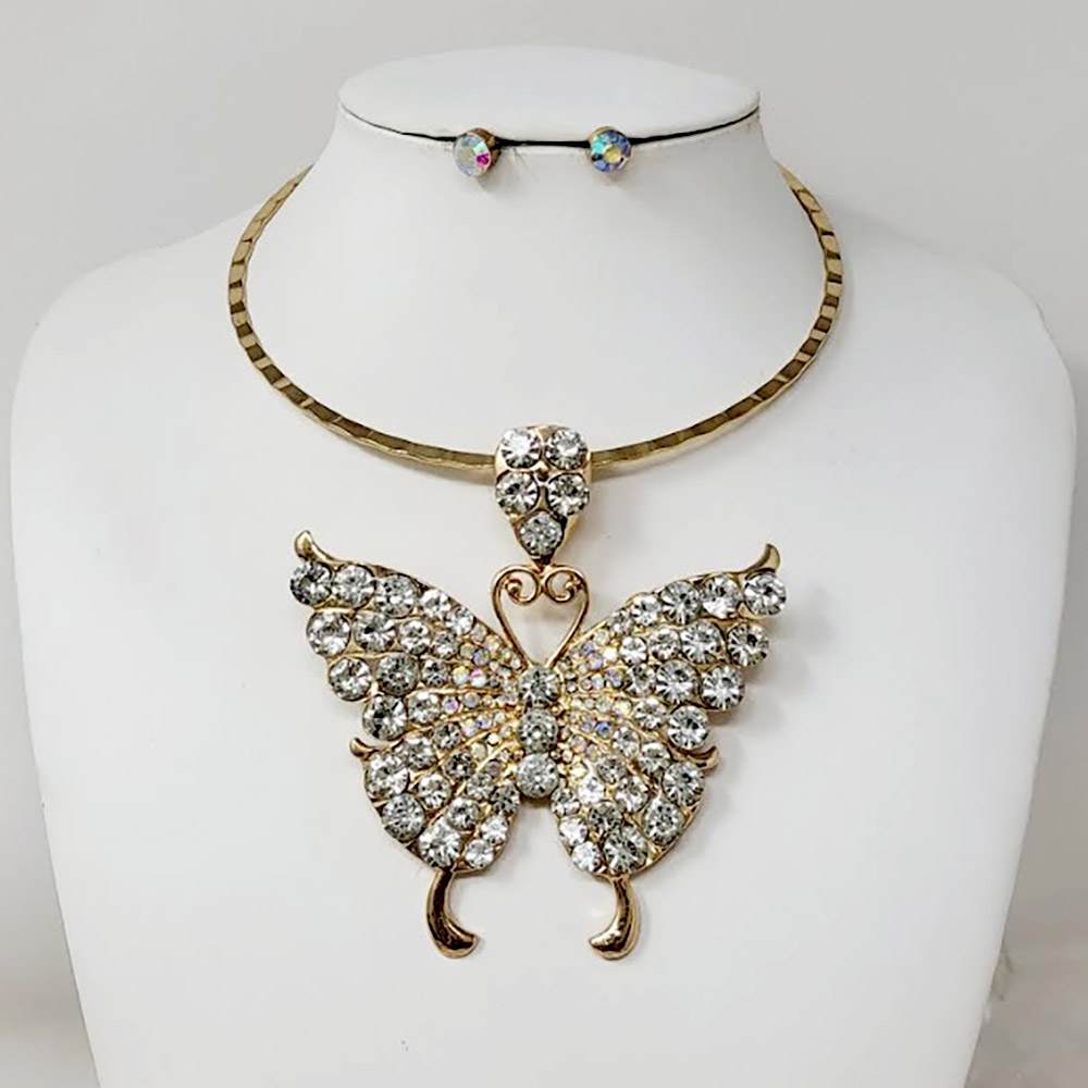 Details • Necklace Size : 15" + 3" L • Pendant Size : 3.5" X 3.8" • Earrings Size : 0.5" L • Shine with elegance in this butterfly pendant necklace paired with matching stud earrings. Adorned with sparkling details, this set is perfect for special occasions, weddings, or evening events. A statement accessory that adds glamour and sophistication, making it a must-have jewelry set. • Lead and Nickel Compliant