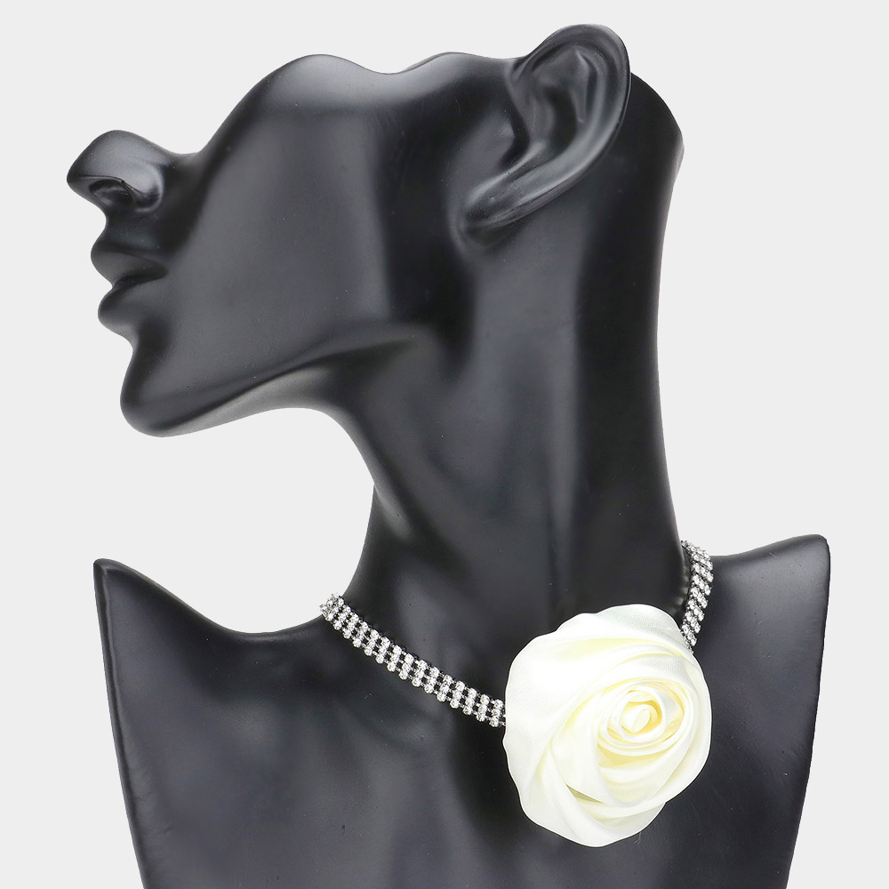 Fabric Flower 3-Row Rhinestone Choker Necklace