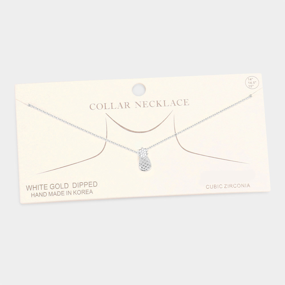 White Gold Dipped Cubic Zirconia Pineapple Pendant Choker Necklace