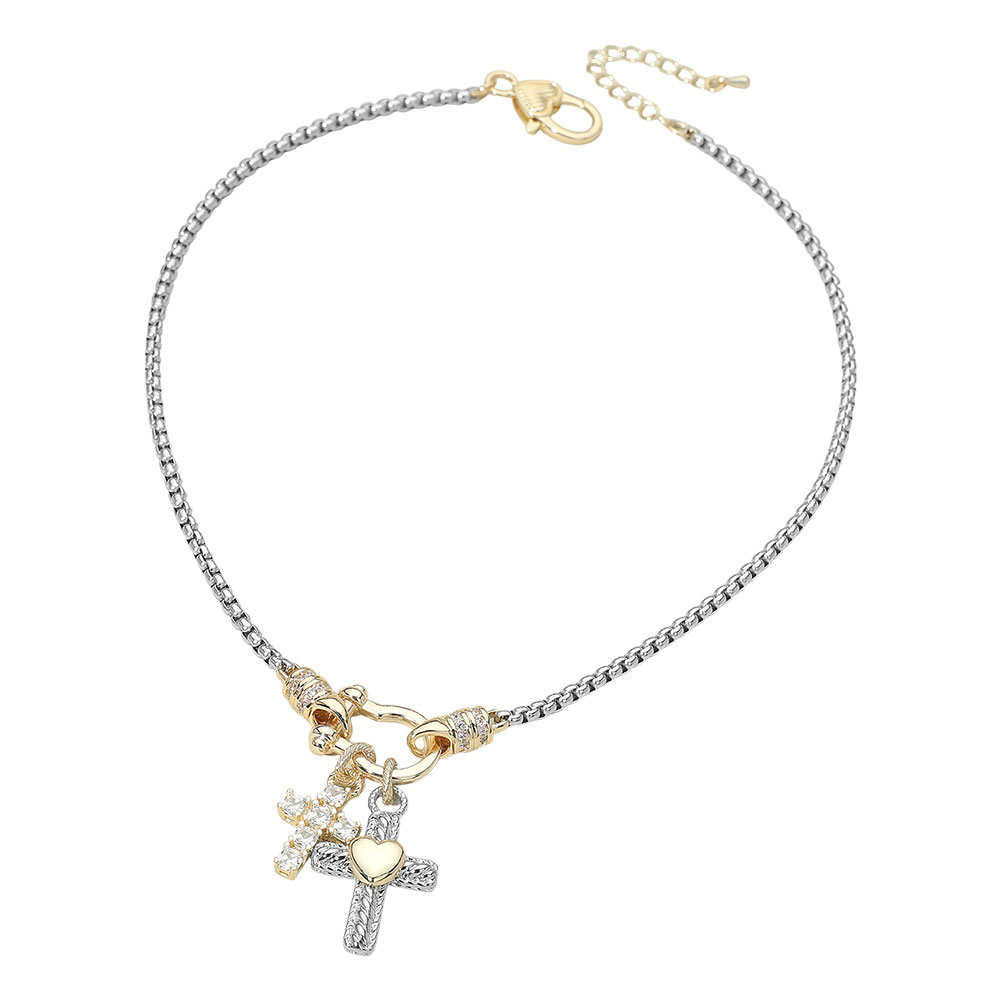 Details • Necklace Size : 18" + 2" L • Pendant Size : 2" L • Elegant chain necklace featuring cross and heart charms accented with sparkling details. Designed with a secure clasp, this meaningful accessory blends faith and style, making it a versatile addition to any jewelry collection. • CZ Cubic Zirconia • Gold Dipped