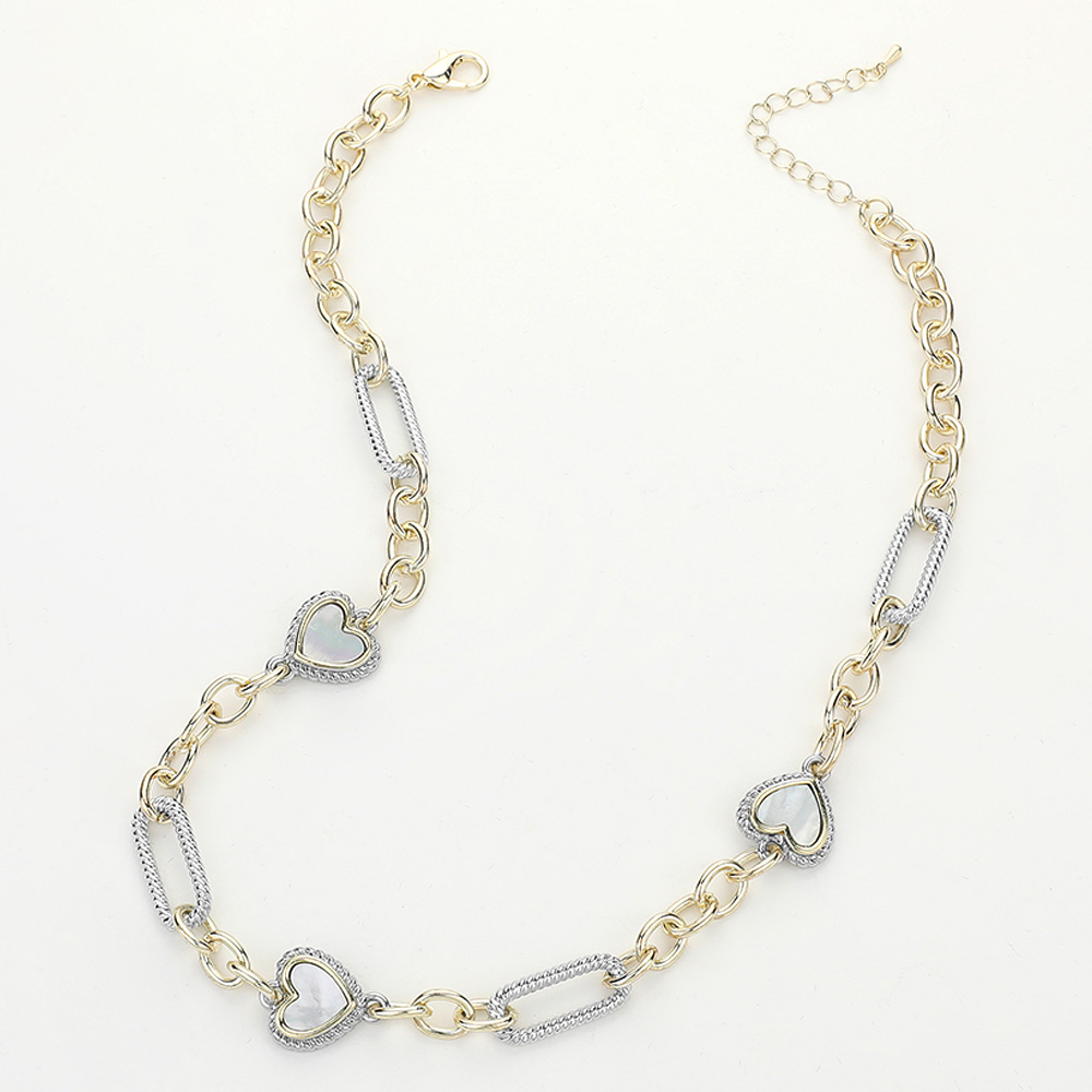 14K Gold Plated Mother of Pearl Heart Station Two Tone Oval Chain Necklace