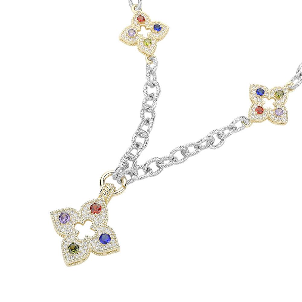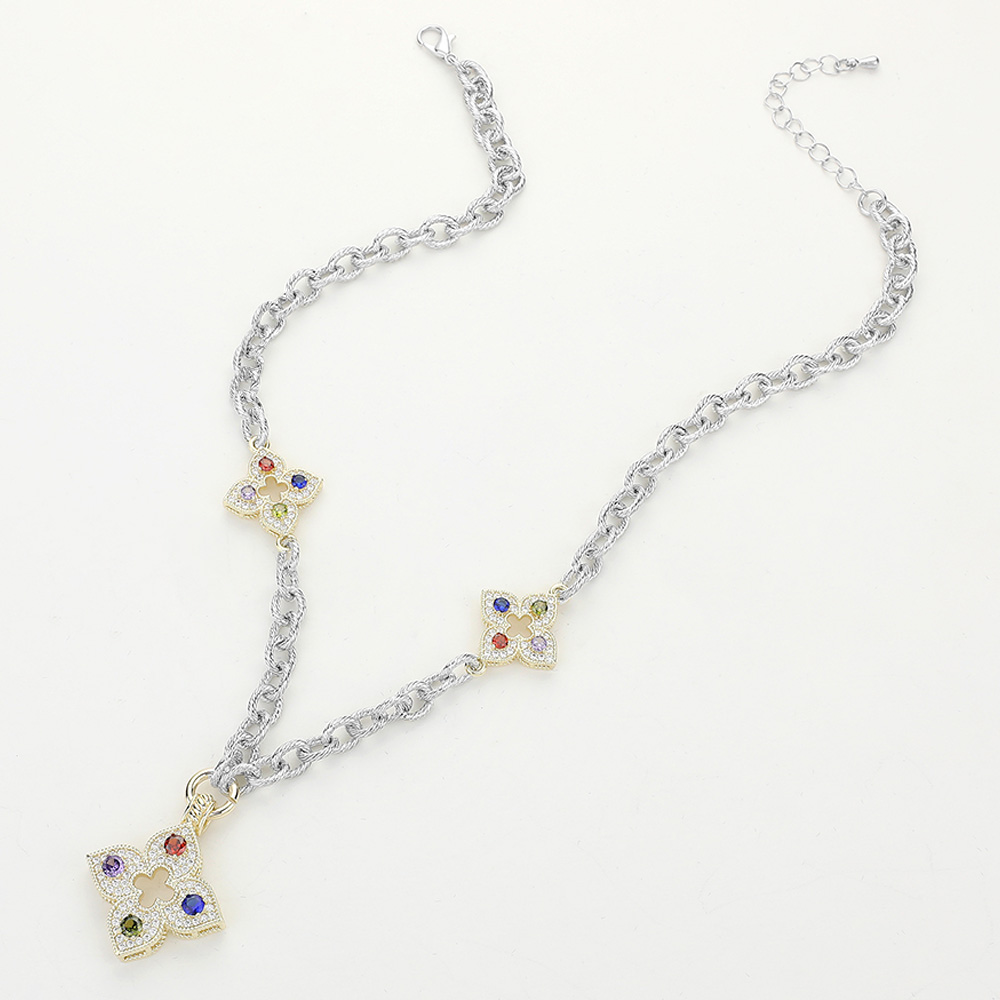 14K Gold Plated Two Tone CZ Stone Paved Clover Pointed Chunky Chain Necklace