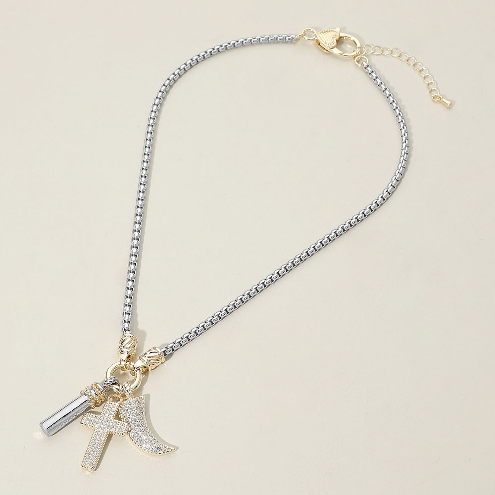 Details • Necklace Size : 17" + 2.5" L • Decor Size : 1.6" L • Discover a standout necklace featuring a trio of sparkling cubic zirconia charms including a cross and crescent, set on a sleek chain for modern elegance. Perfect for everyday styling or meaningful gifting with eye-catching brilliance and refined appeal. • CZ Cubic Zirconia • Gold Dipped