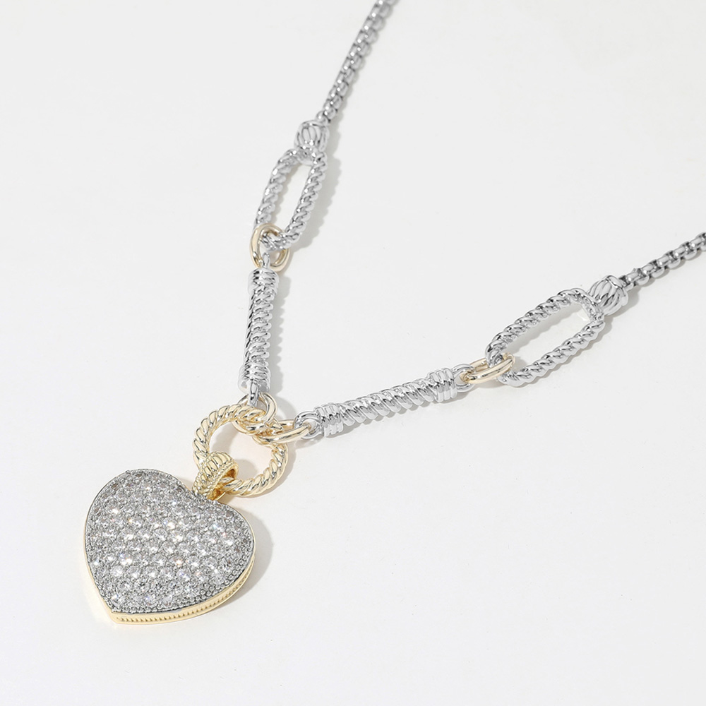 14K Gold Plated Two Tone CZ Stone Paved Heart Pendant Necklace