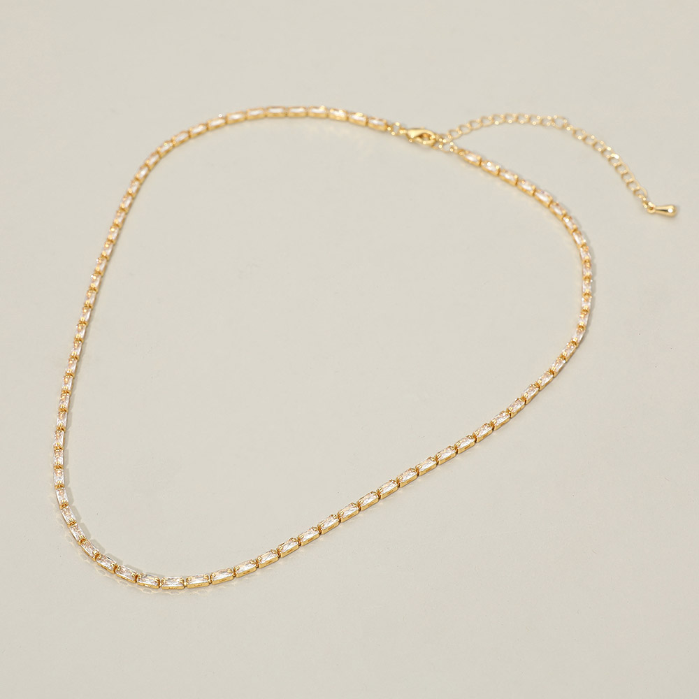 Details • Necklace Size : 16" + 3" L • Decor Size : 0.1" L • Sophisticated tennis necklace featuring sleek baguette-cut crystals for a refined and modern look. Perfect for layering or wearing solo to enhance any outfit with subtle luxury. A timeless jewelry piece that adds elegance and brilliance to both everyday and formal styles. • Gold Dipped • Lead and Nickel Compliant