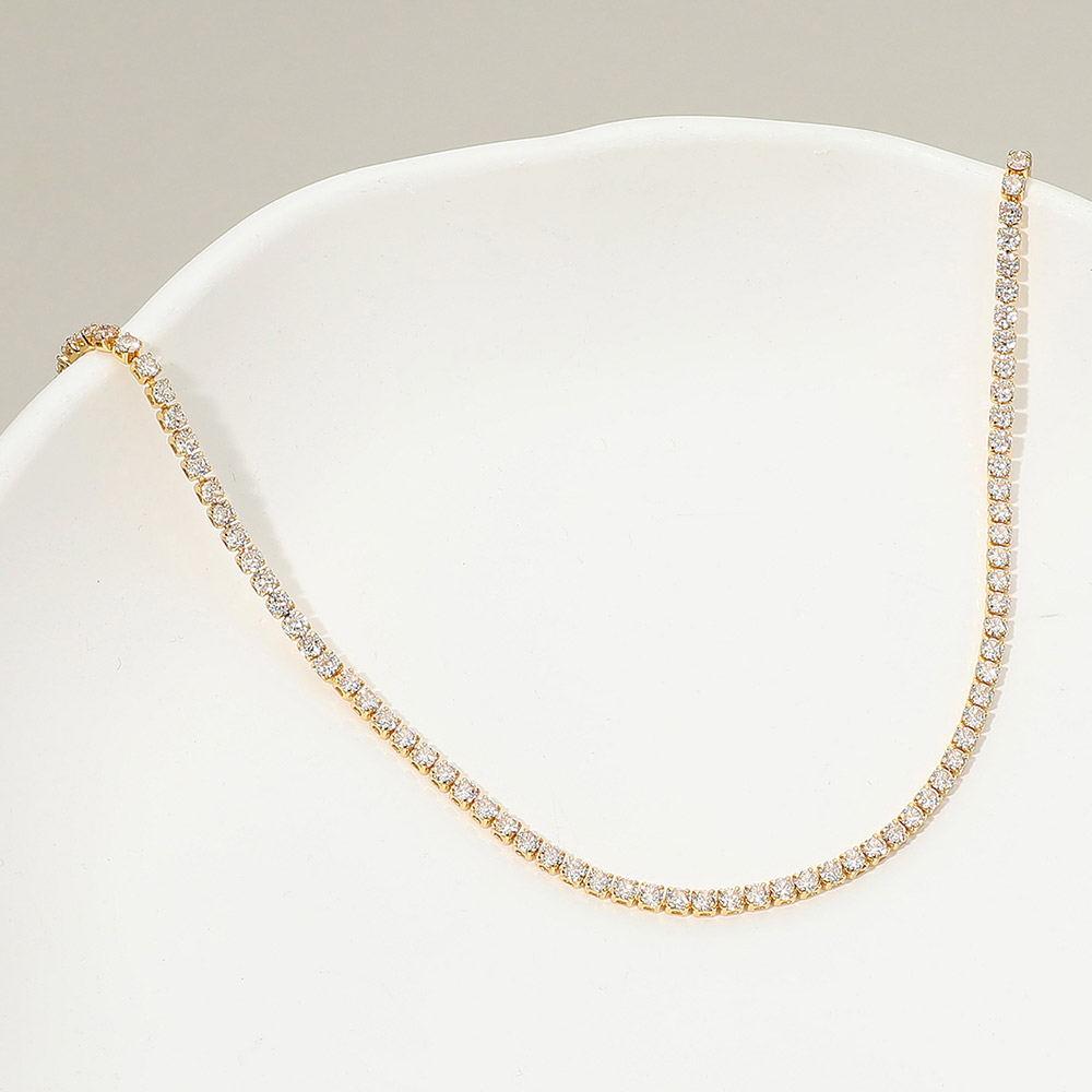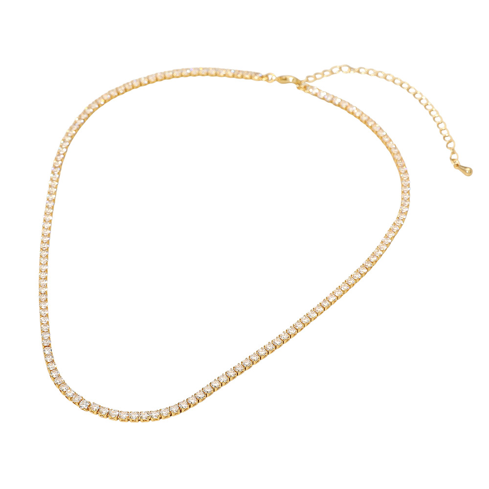 Details • Necklace Size : 16" + 3" L • Decor Size : 0.1" L • Refined tennis chain necklace featuring a row of sparkling crystal accents for a timeless and luxurious look. Perfect for layering or wearing solo, it enhances any outfit with subtle sophistication. Ideal for special occasions or daily elegance in any jewelry collection. • Gold Dipped • Lead and Nickel Compliant