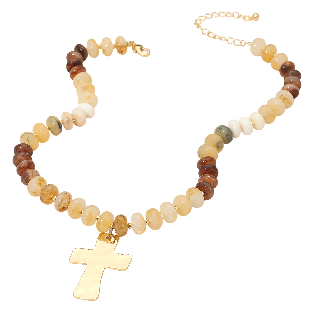 18K Gold Dipped Hammered Cross Plate Pendant Chunky Resin Disc Beaded Necklace