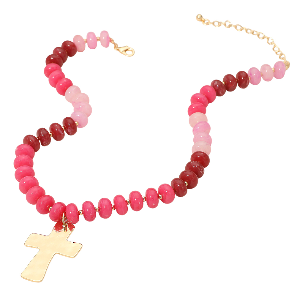 18K Gold Dipped Hammered Cross Plate Pendant Chunky Resin Disc Beaded Necklace